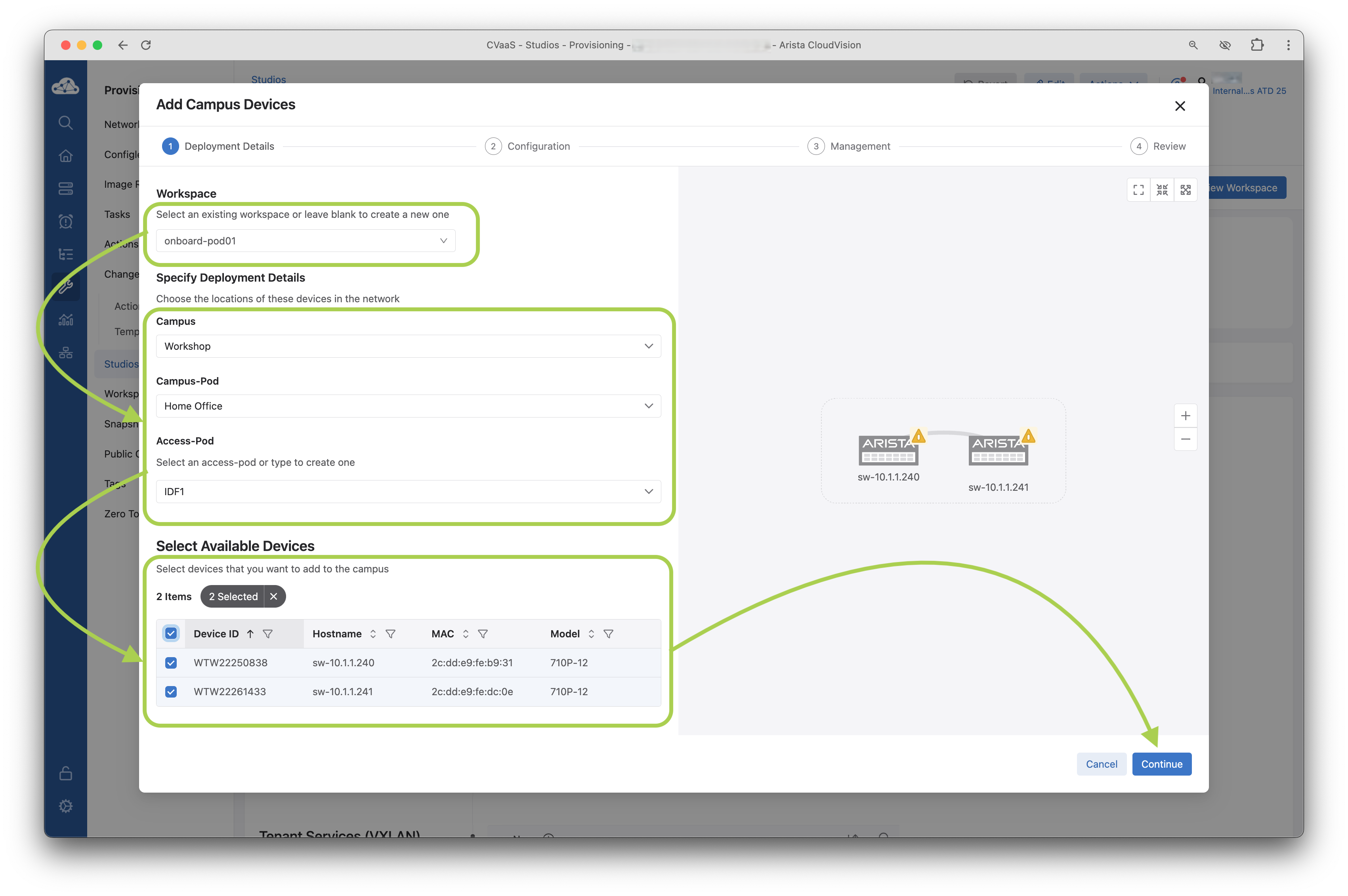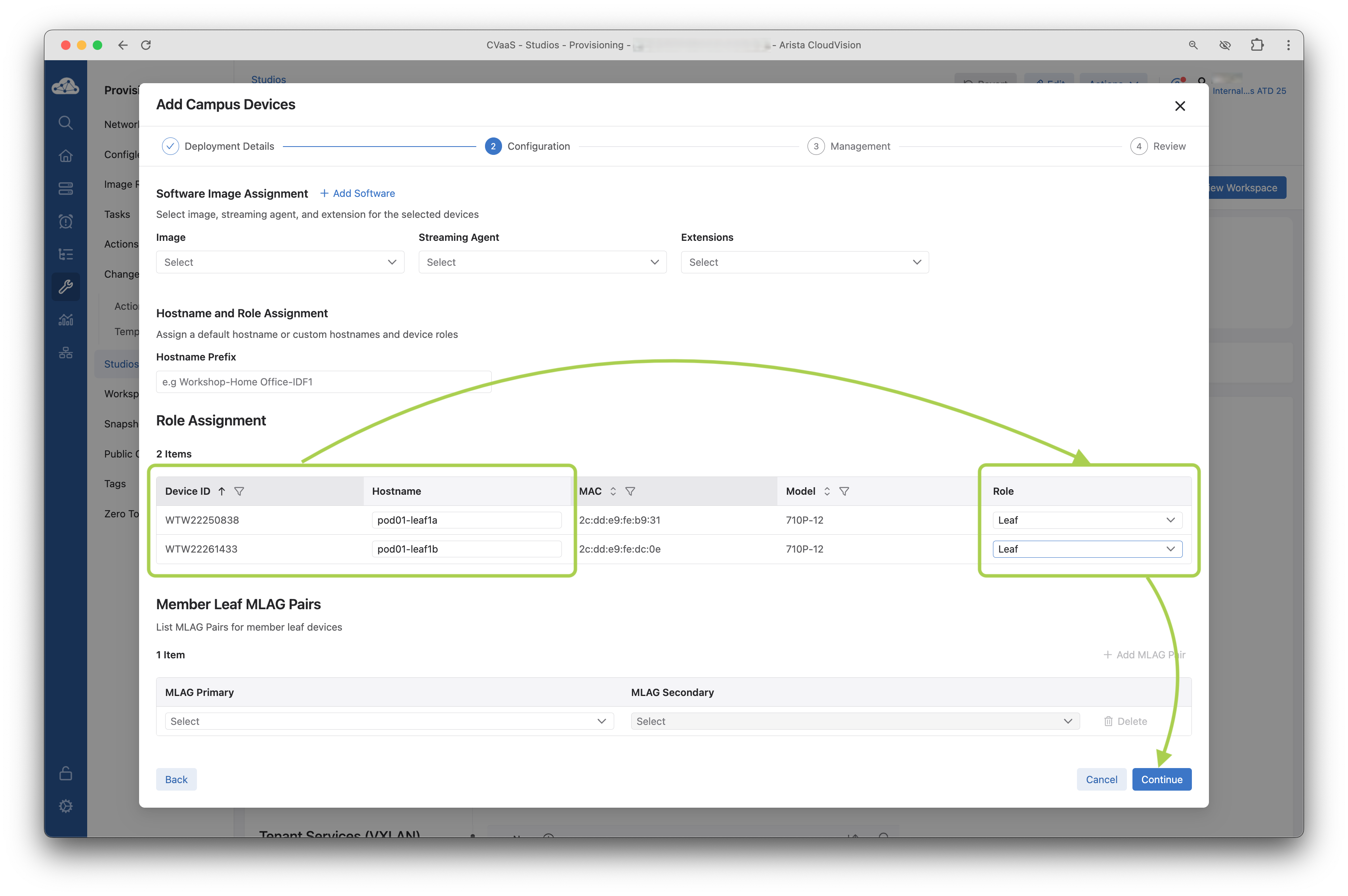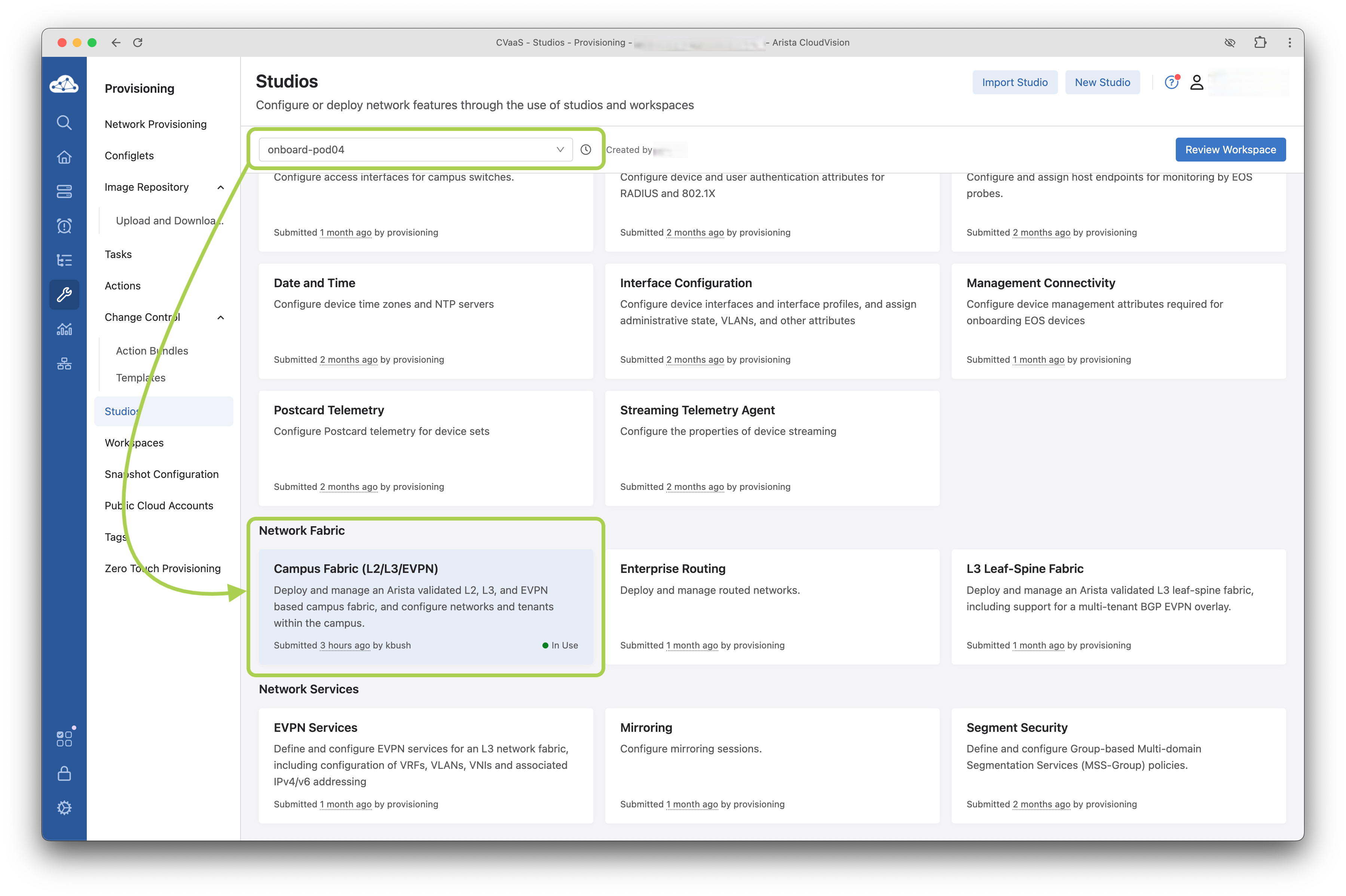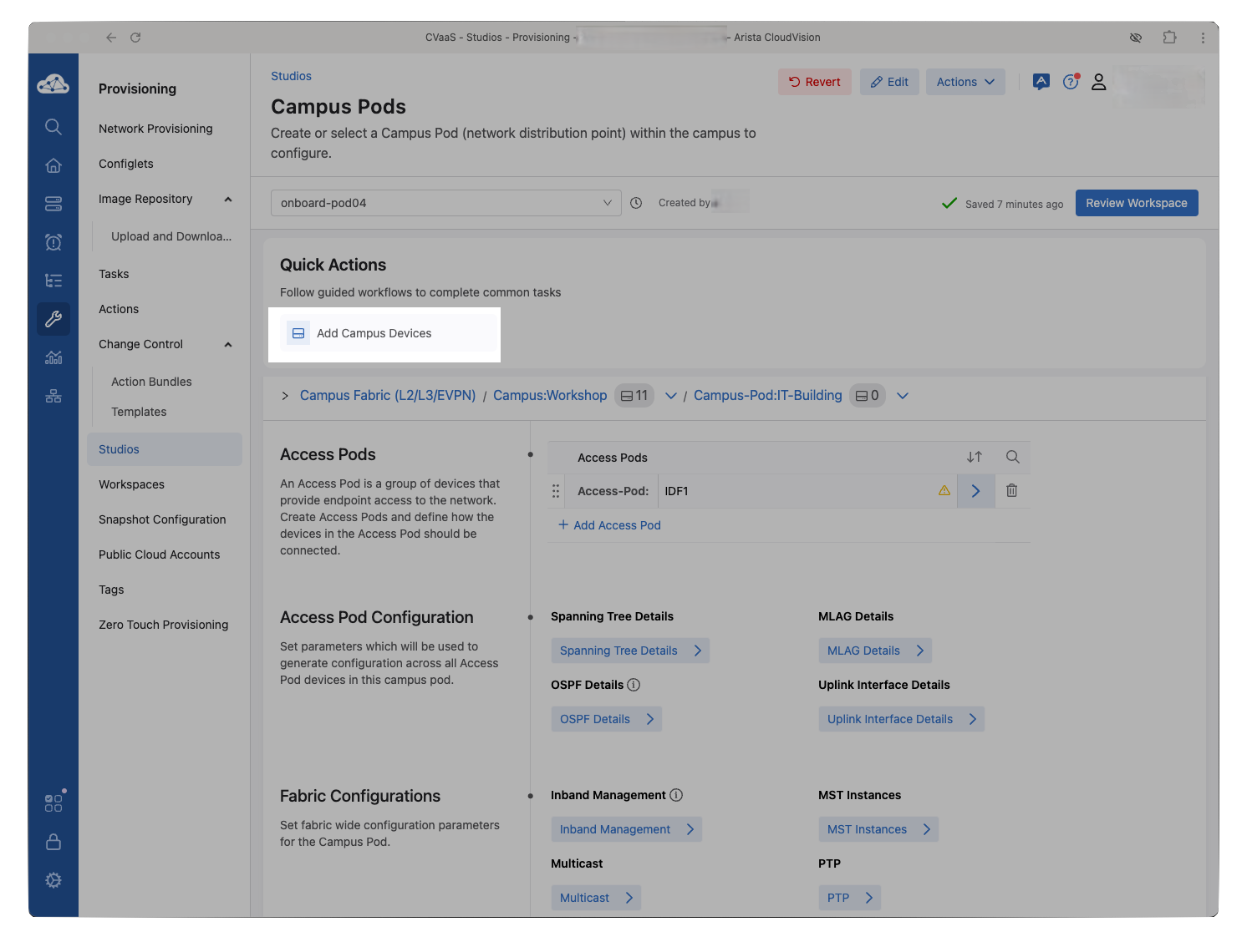 In this lab you will be onboarding your switch using CloudVision Studios, adding your new campus leaf switch to an existing Campus Fabric.