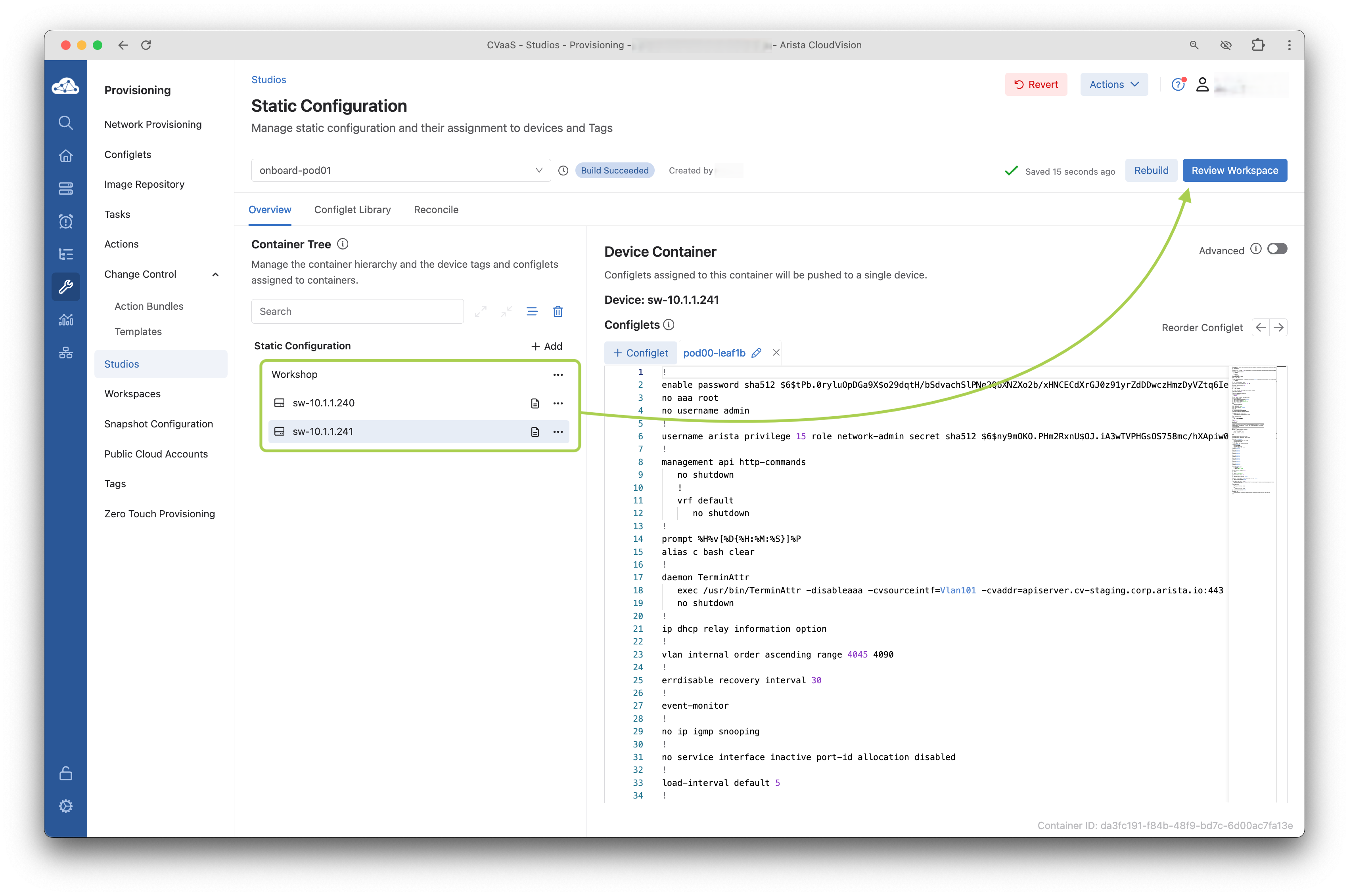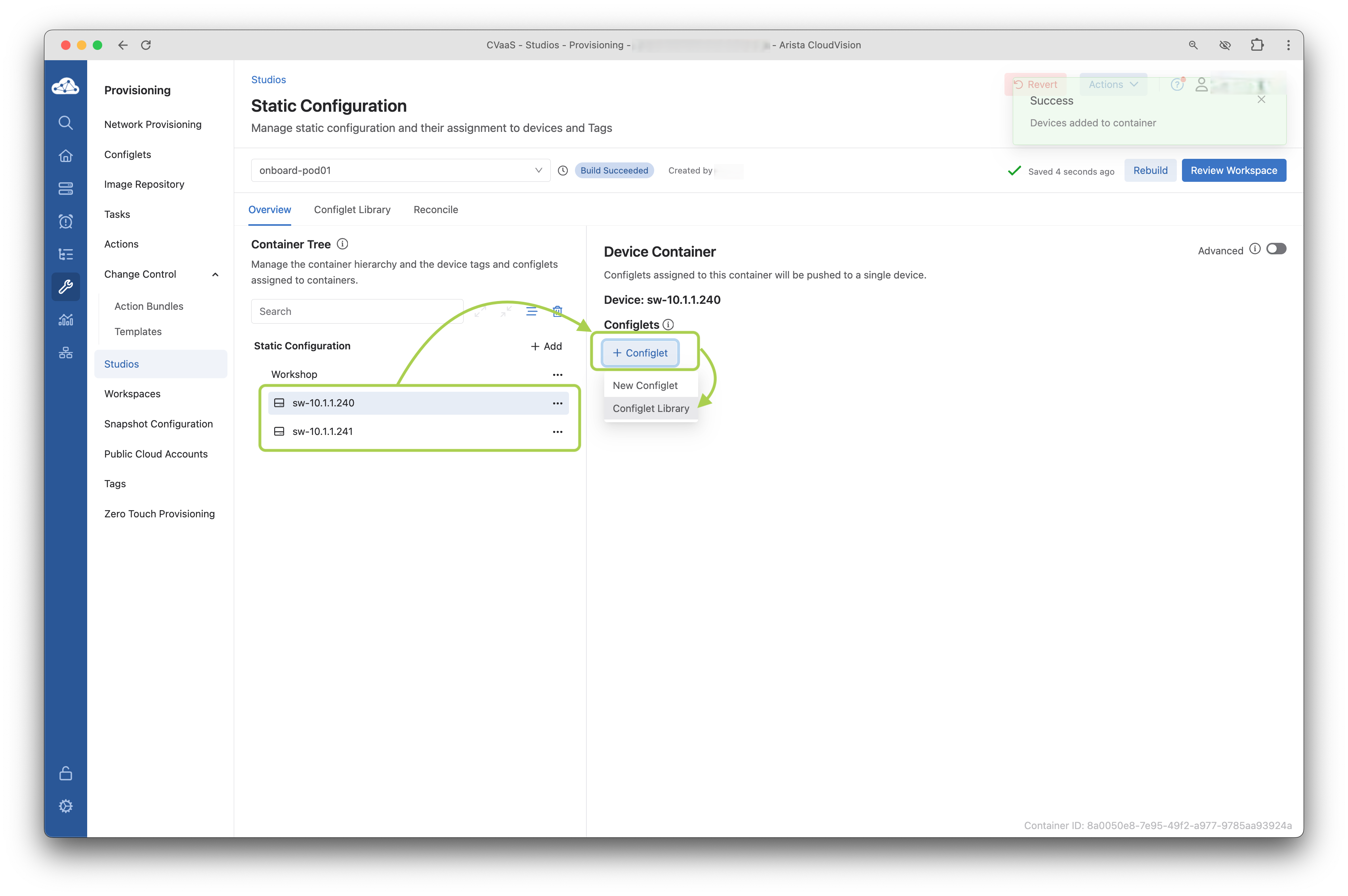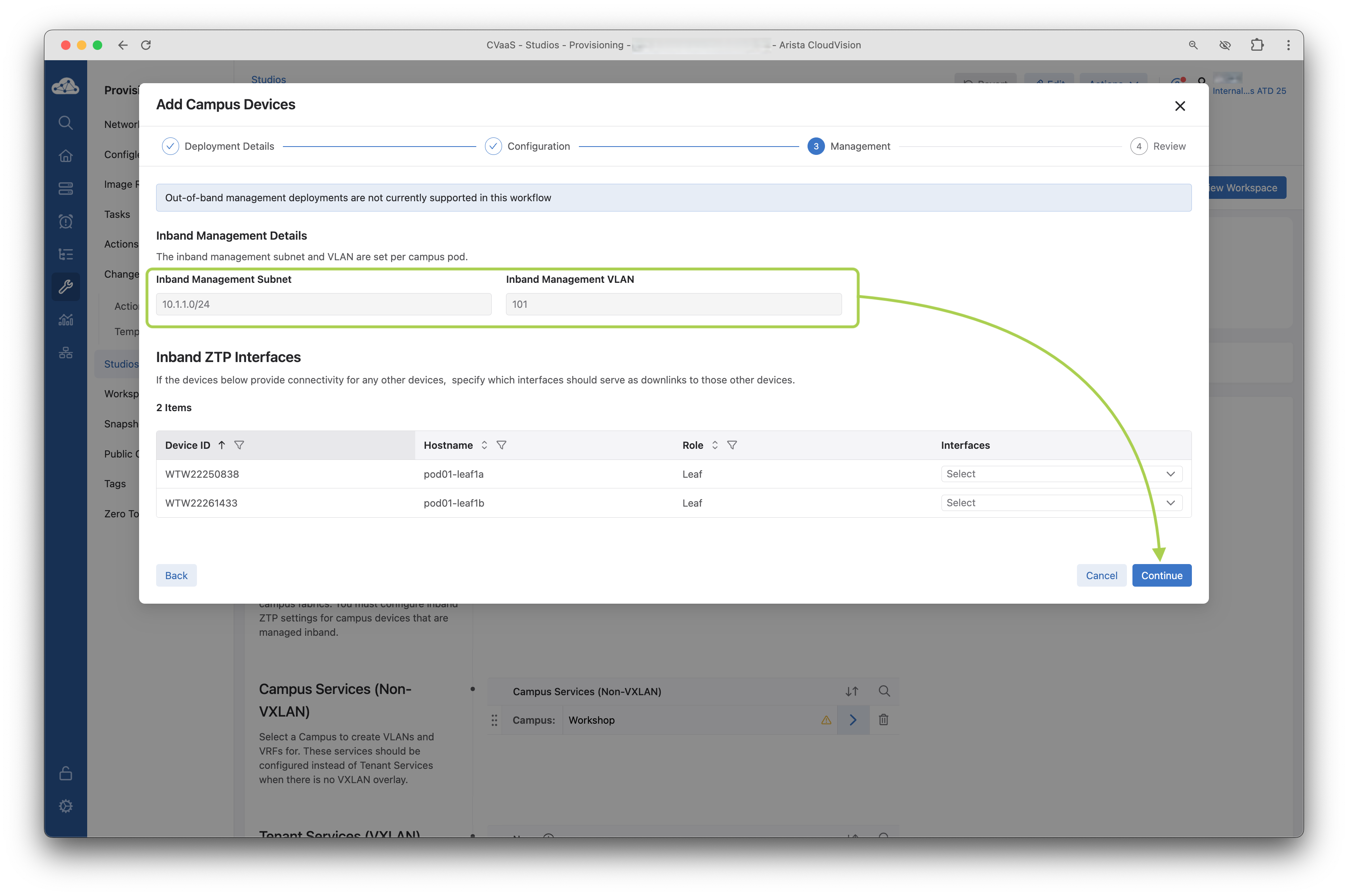 In this lab you will be onboarding your switch using CloudVision Studios, adding your new campus leaf switch to an existing Campus Fabric.