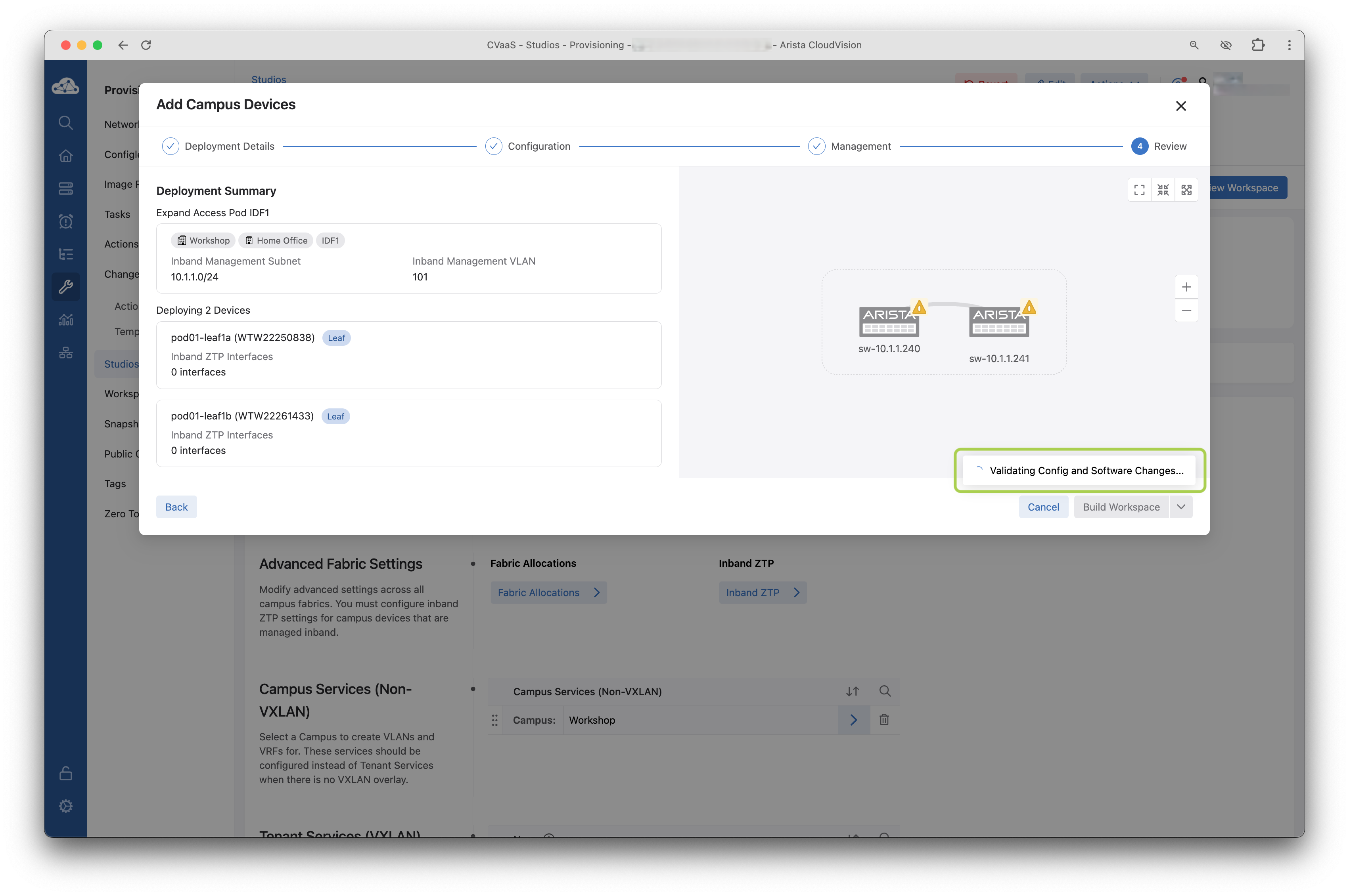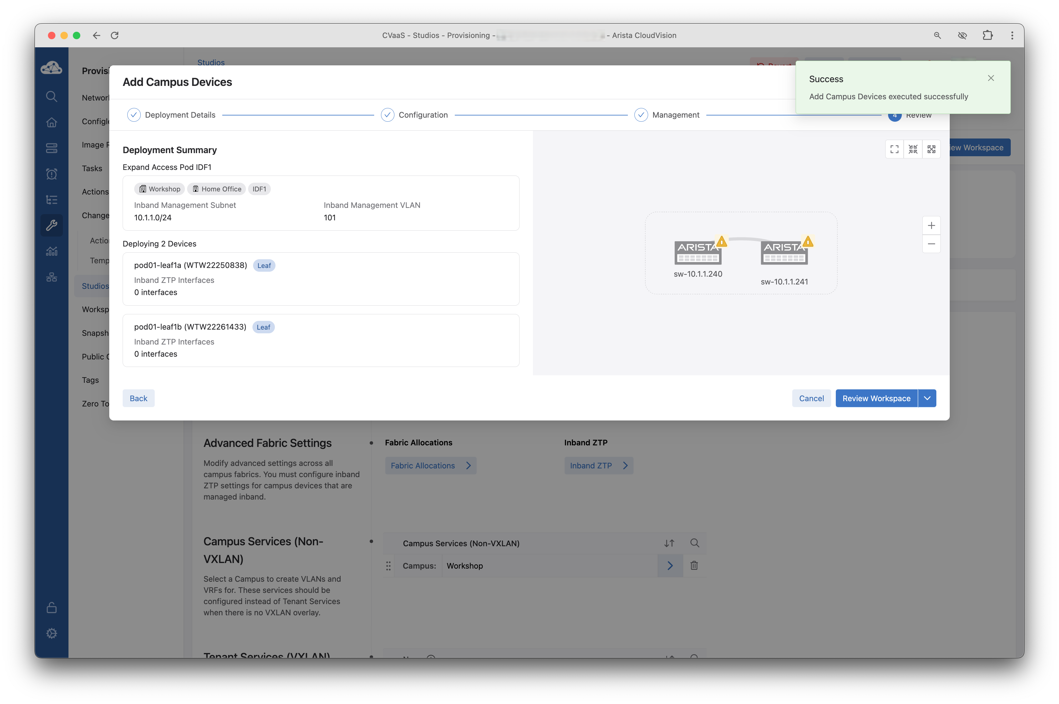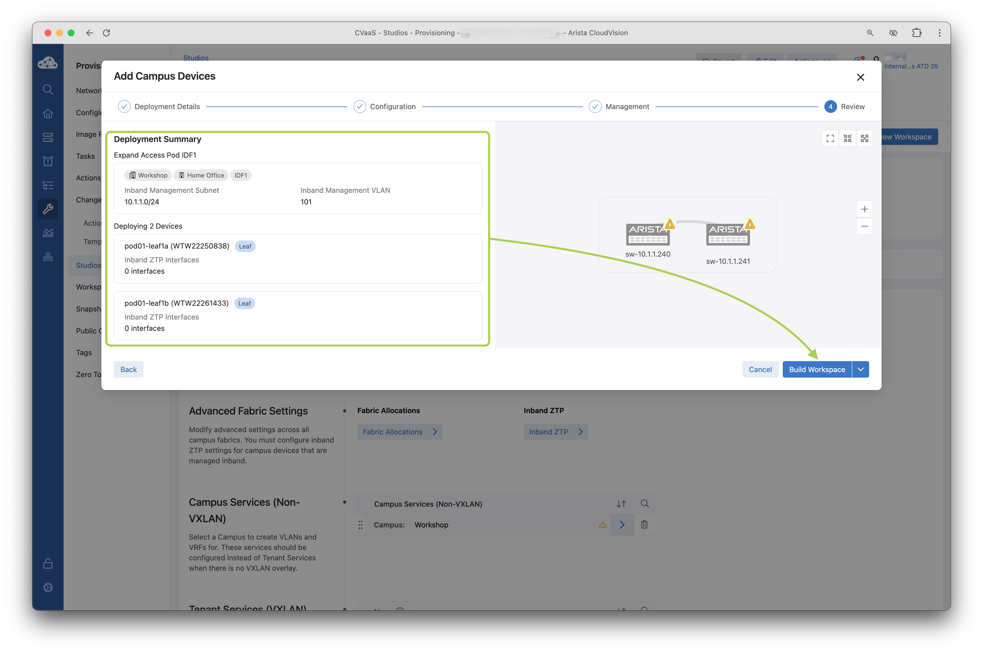 Summarybox, there are several studios modified:Inventory and Topology: Devices selected are simply added to the Campus inventoryCampus Fabric (L2/L3/EVPN): Devices we're added to their respective Campus Access PodIDF1and will inherit configuration from that part of the campus.