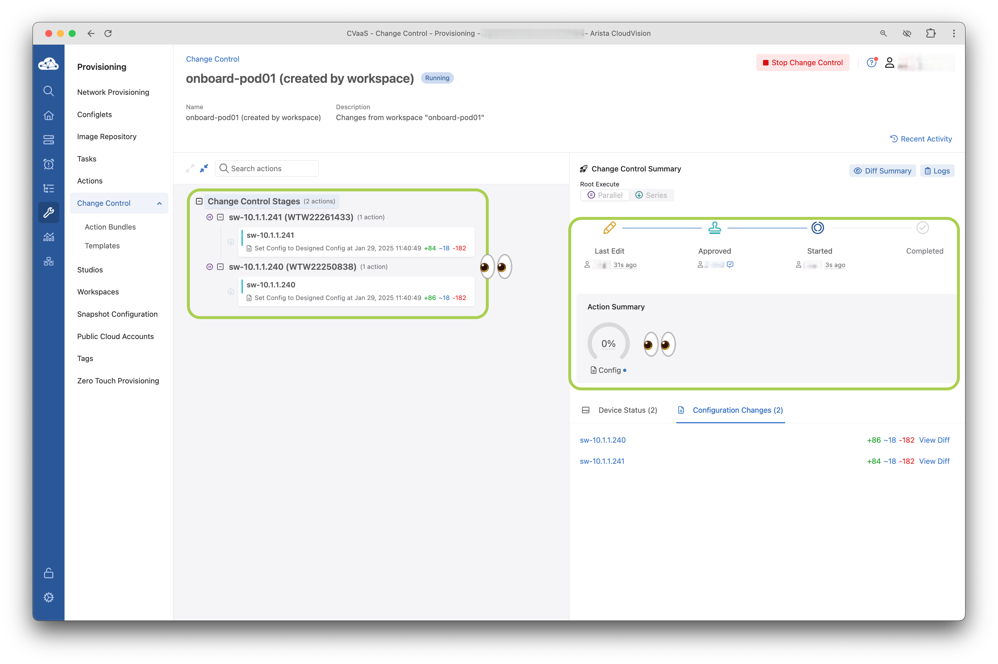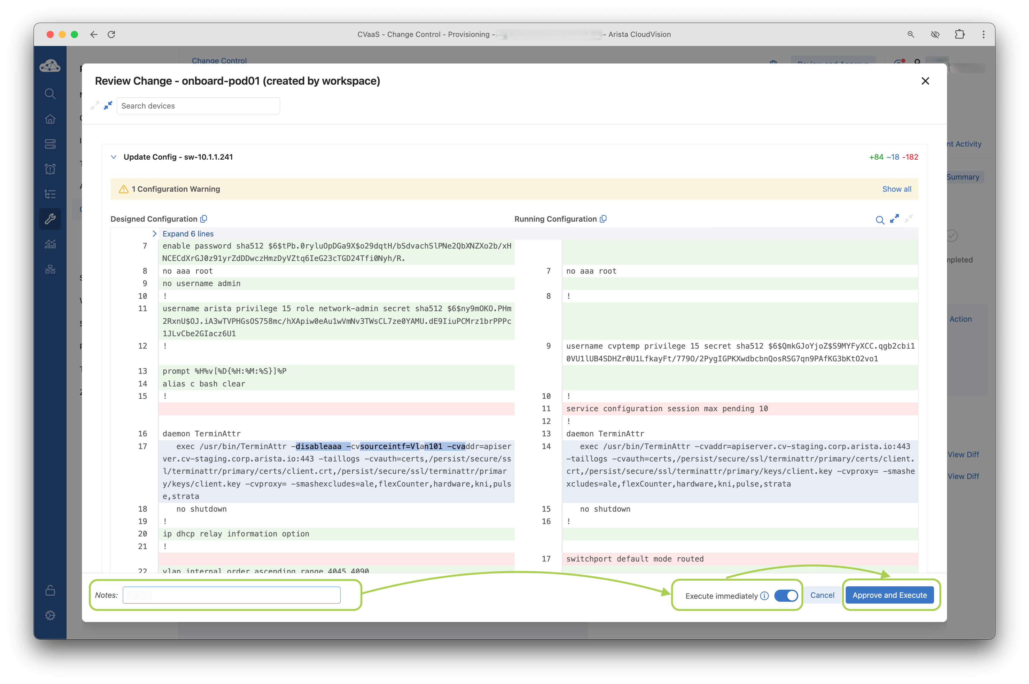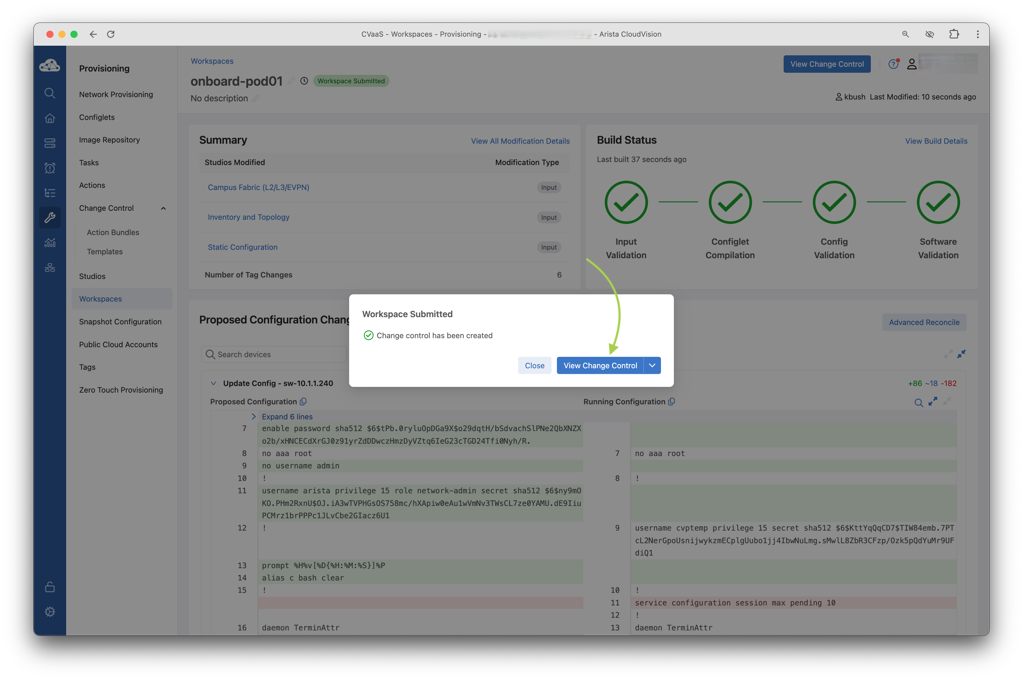 Within the Change Control, you can review the configurations as we just did in the workspace. This is geared towards encouraging or enforcing review of changes prior to execution.