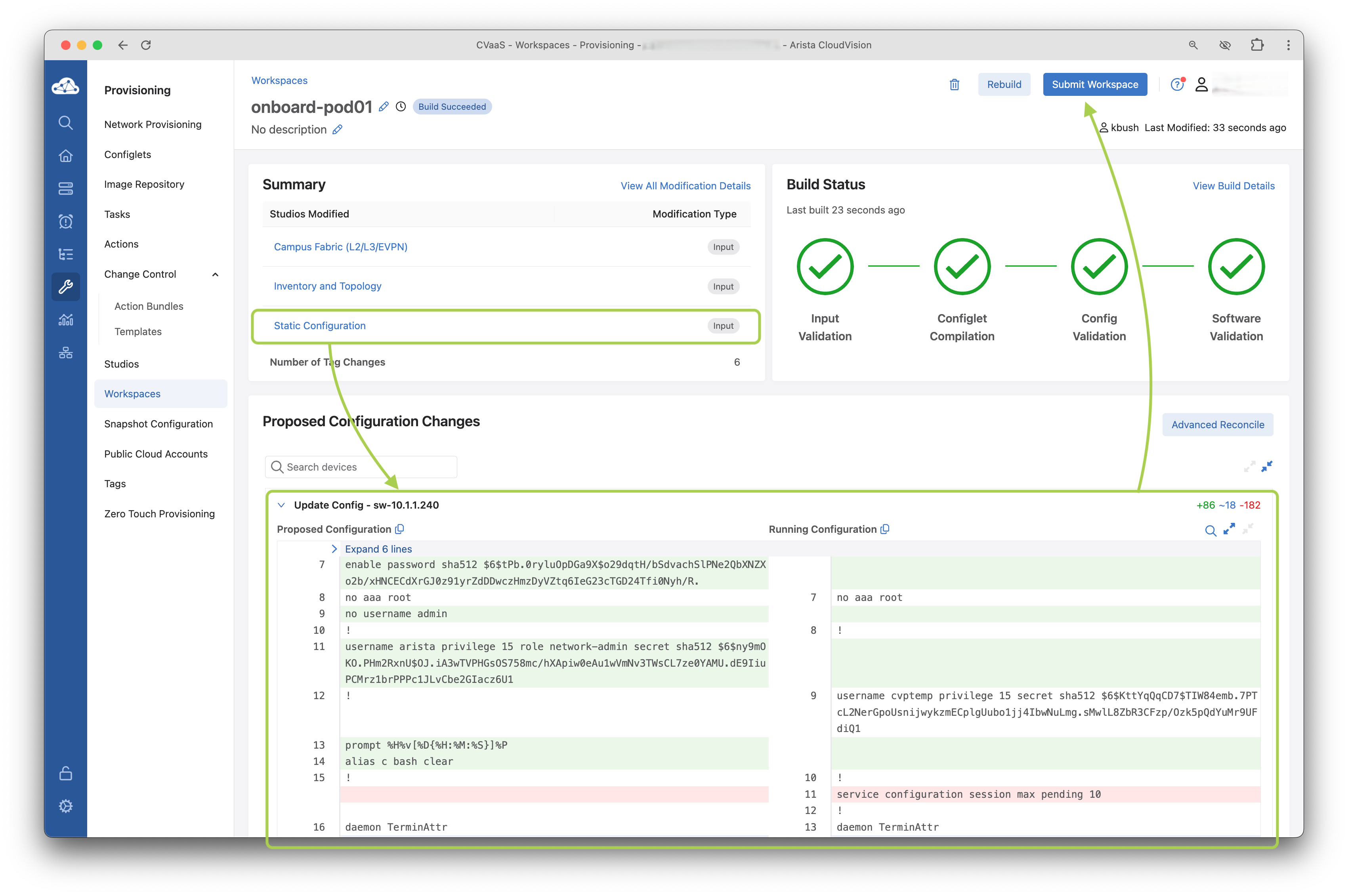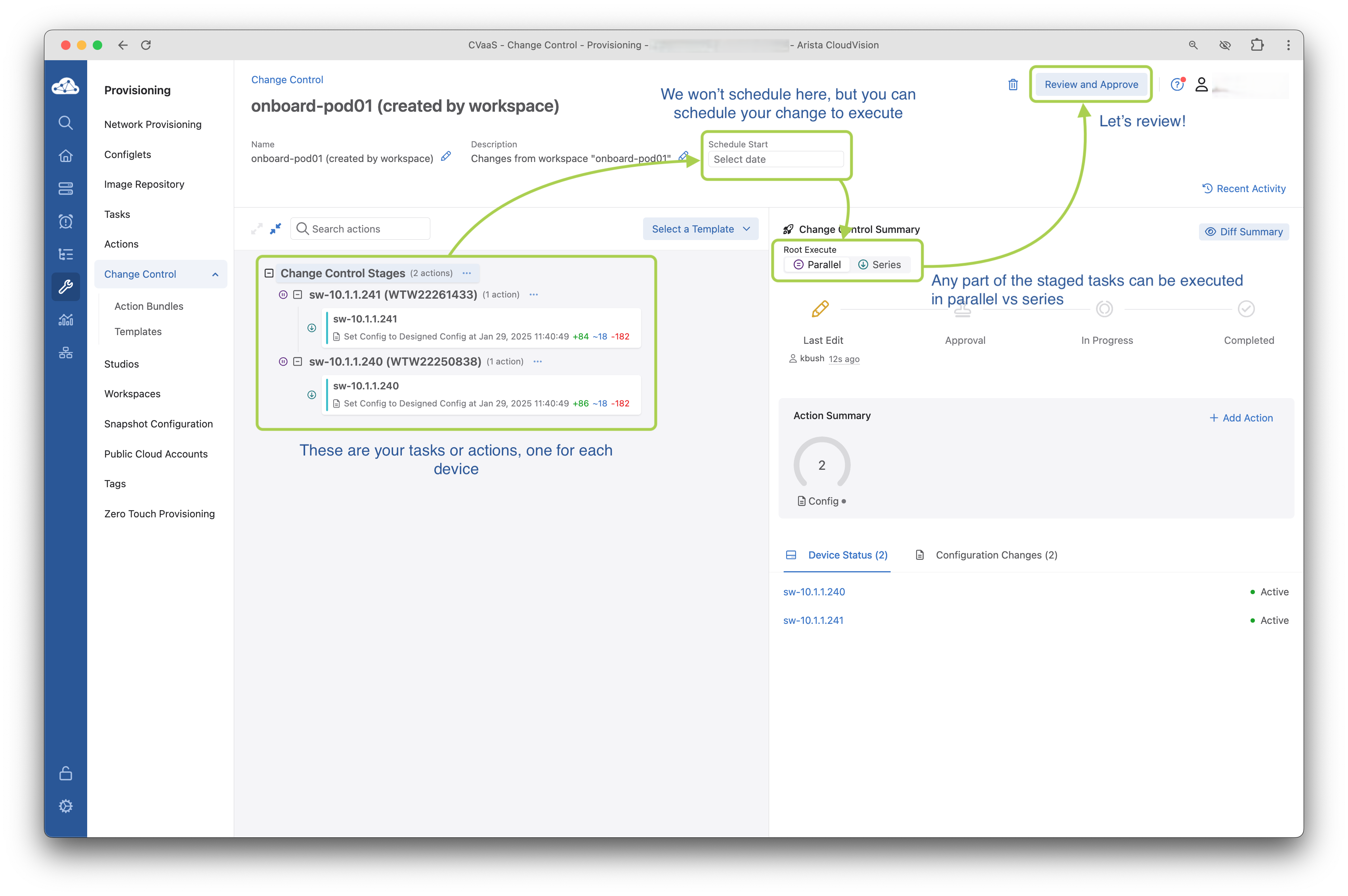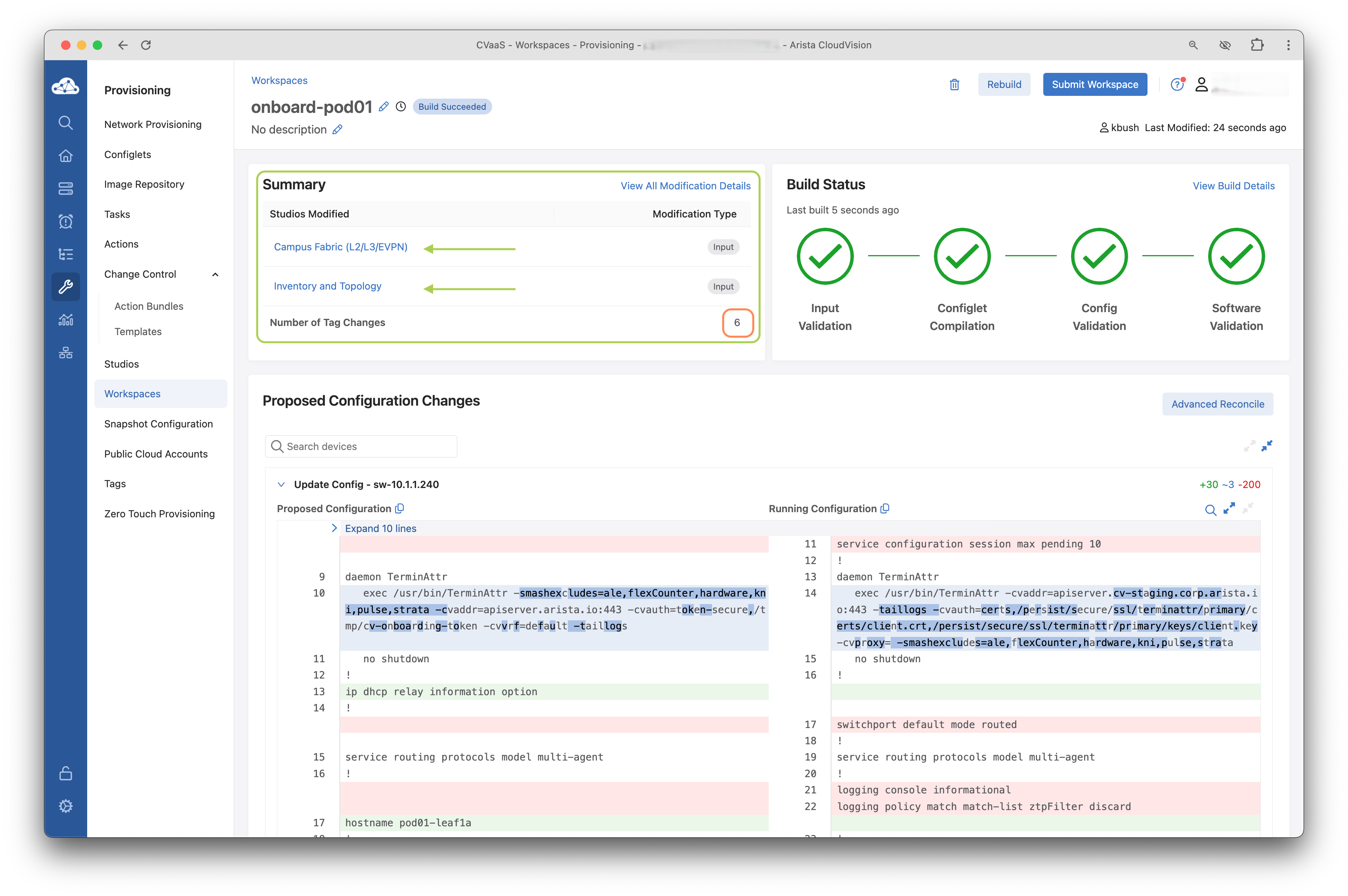 Within the Change Control, you can review the configurations as we just did in the workspace. This is geared towards encouraging or enforcing review of changes prior to execution.