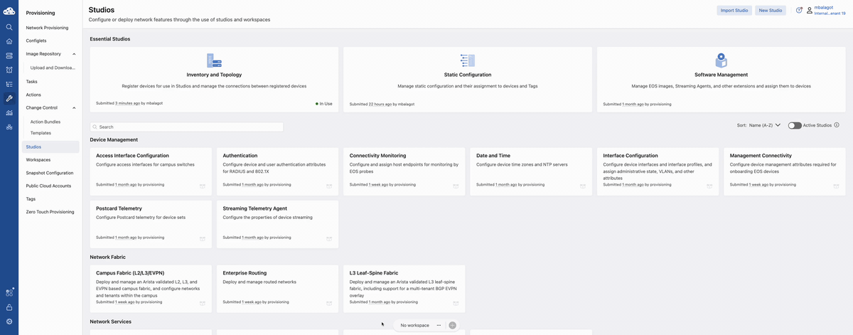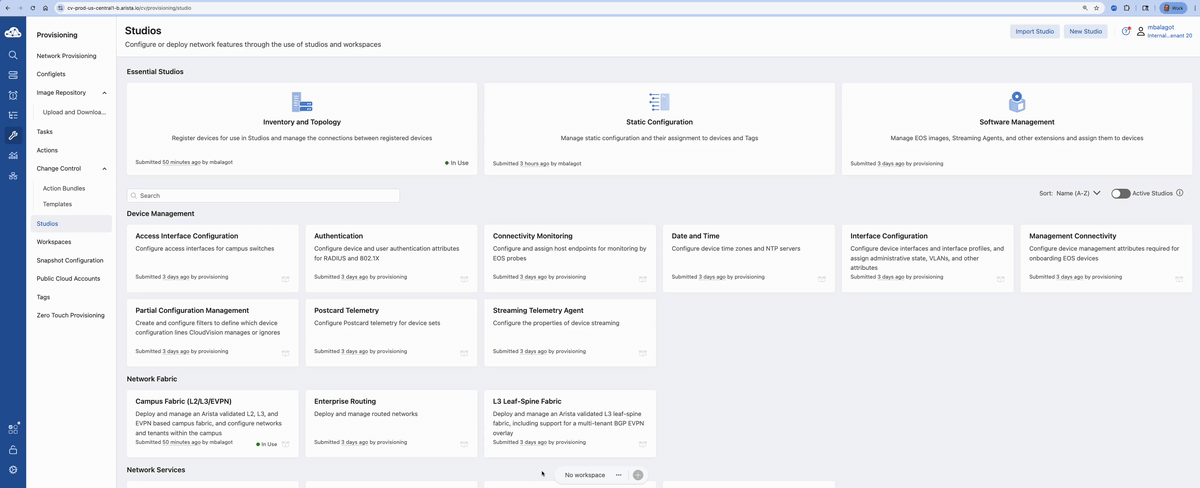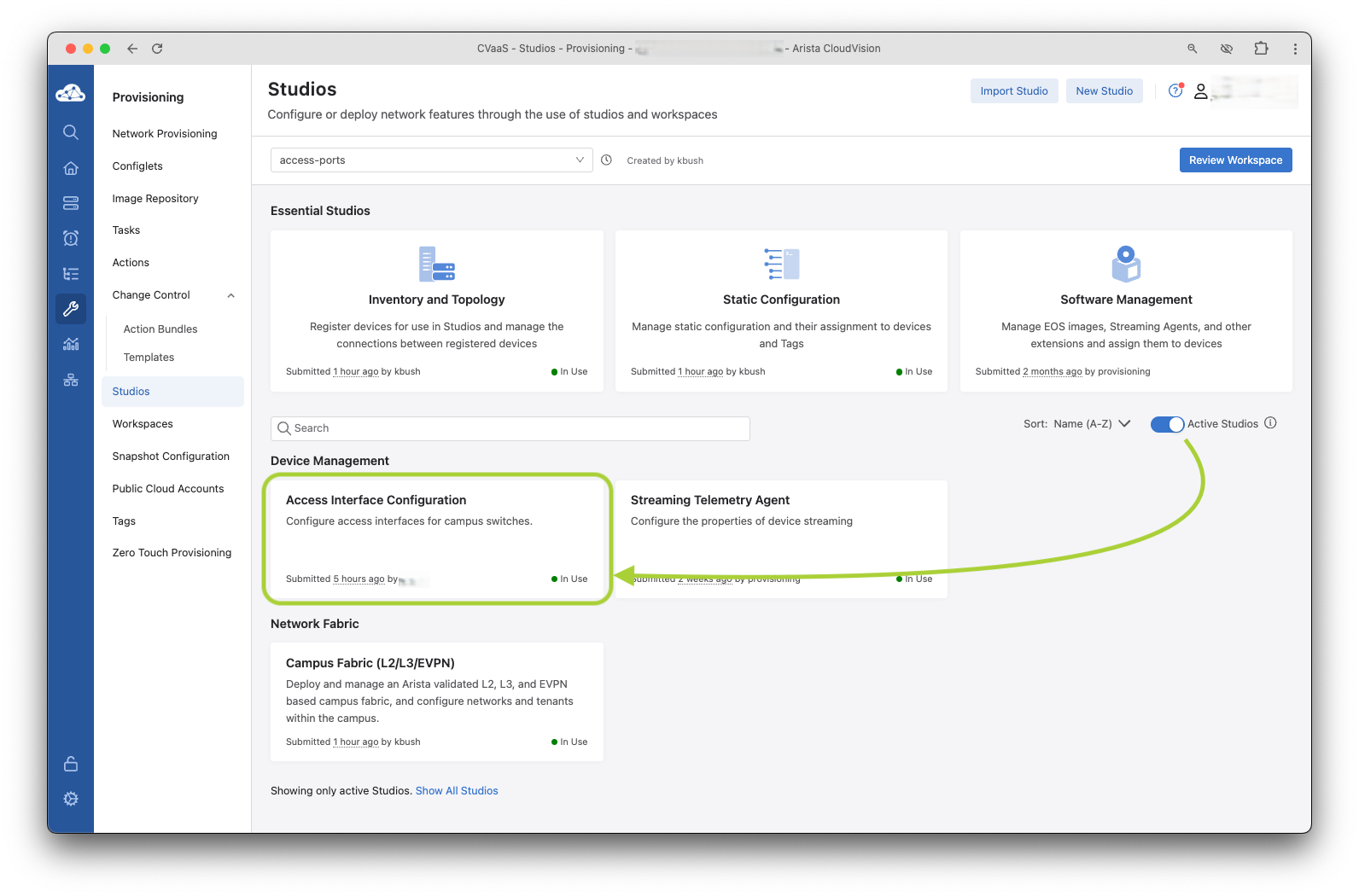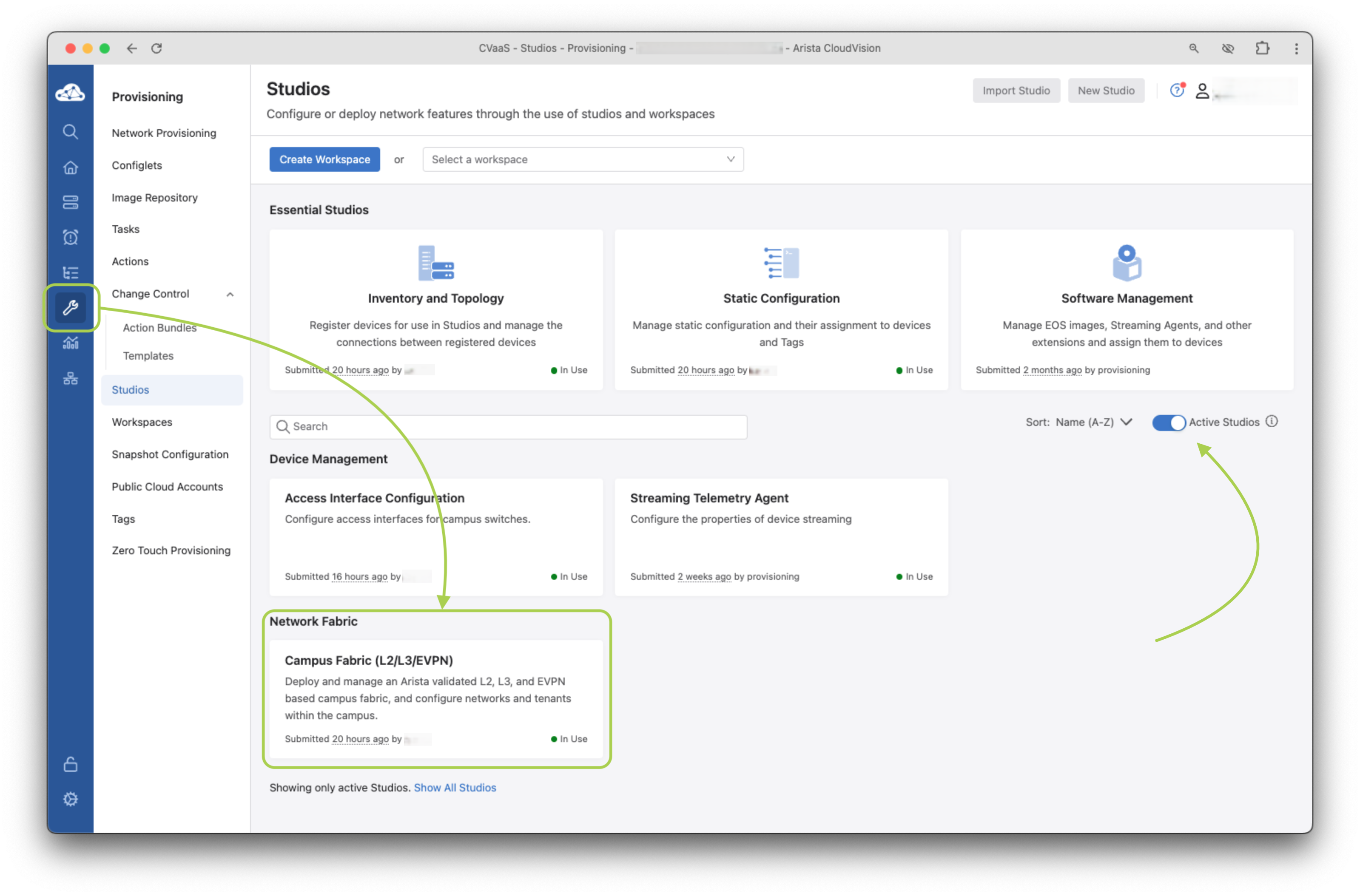 Studioshome page, disable theActive Studiostoggle to display all available CloudVision Studios (which when enabled will only show used/active Studios).The toggle may already be in the disabled position