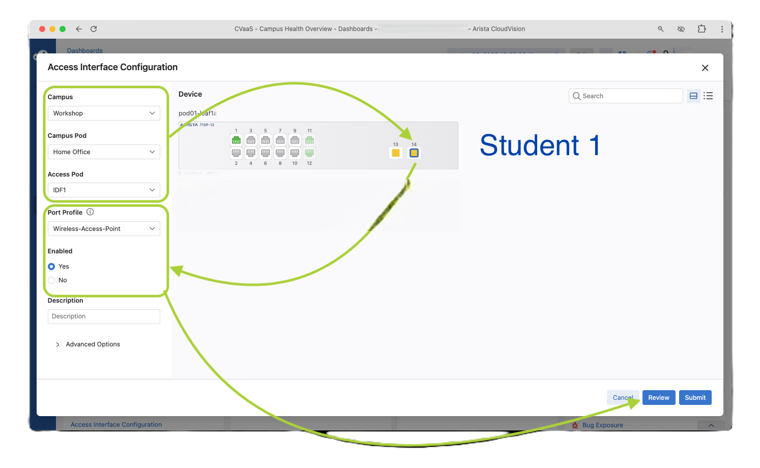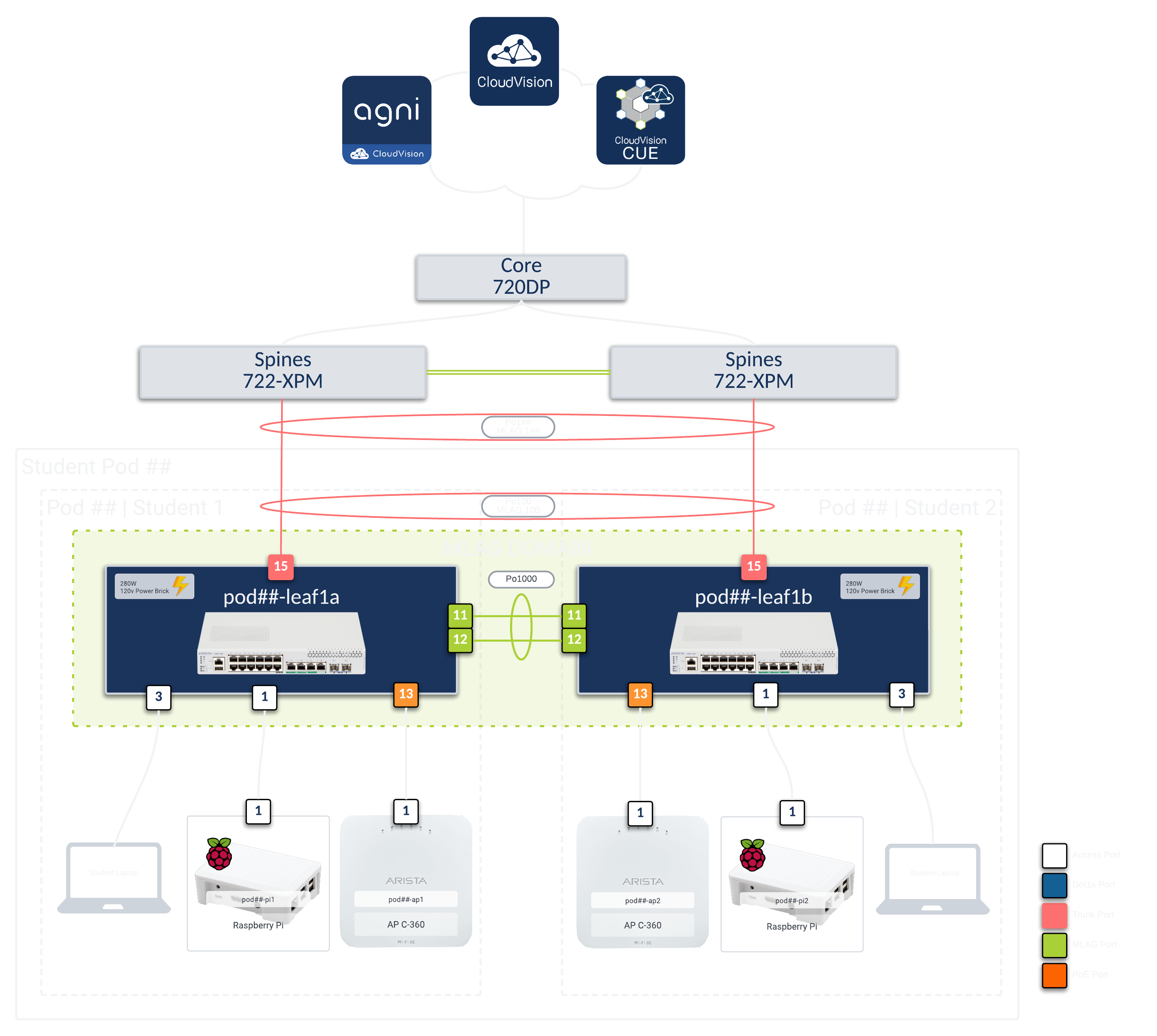 This lab combines two essential CloudVision workflows: onboarding switches using Inventory Studio and configuring access interfaces. You'll learn to use CloudVision's visual interface to add new devices and then configure port profiles for connected hosts.