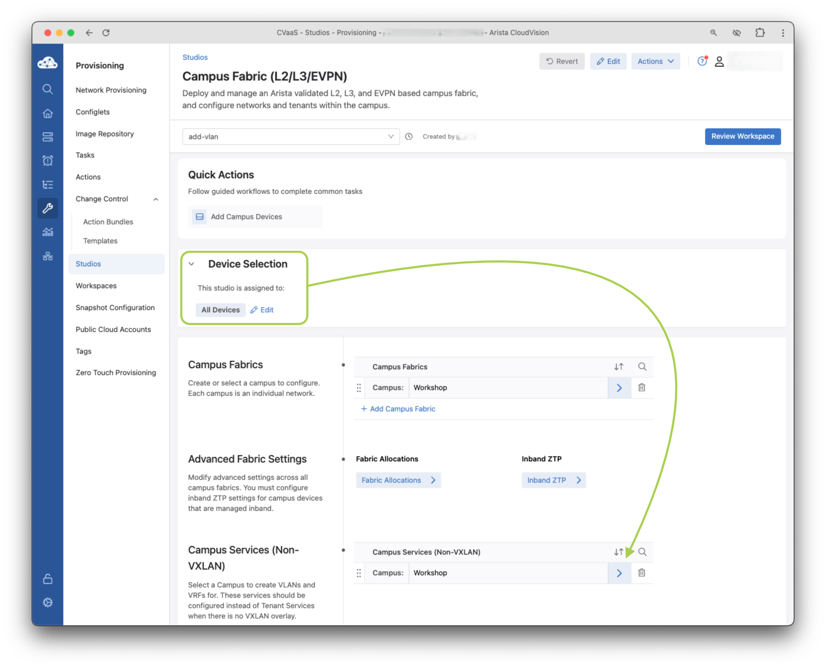 + Add Campus Fabric. TypeWorkshopand click+ Create "Workshop" - On Workspace Review, click