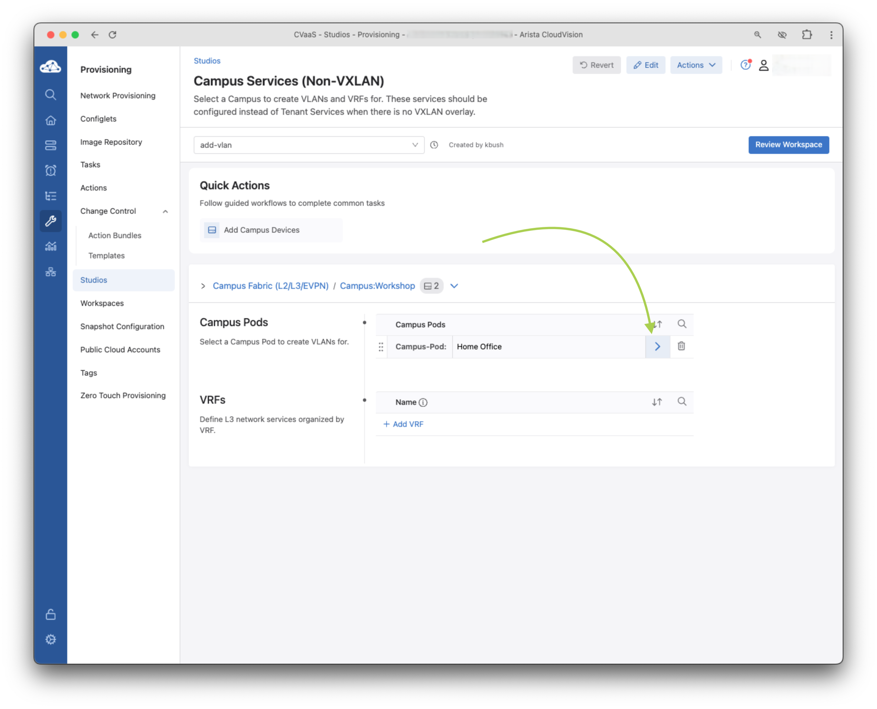 Within the Campus Services (Non-VXLAN)navigate toCampus: Workshop > Campus-Pod: Home Officeusing the arrow on the right
