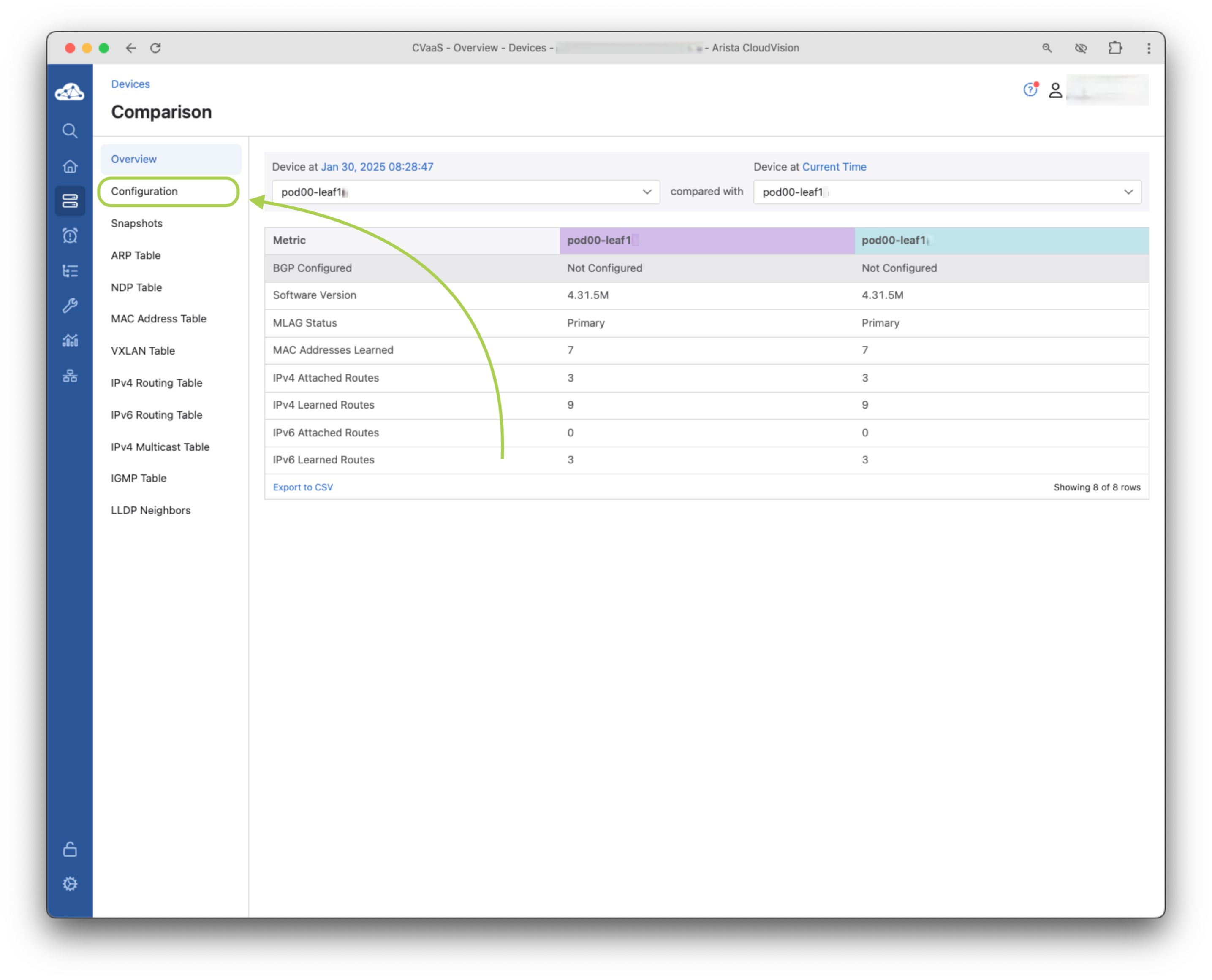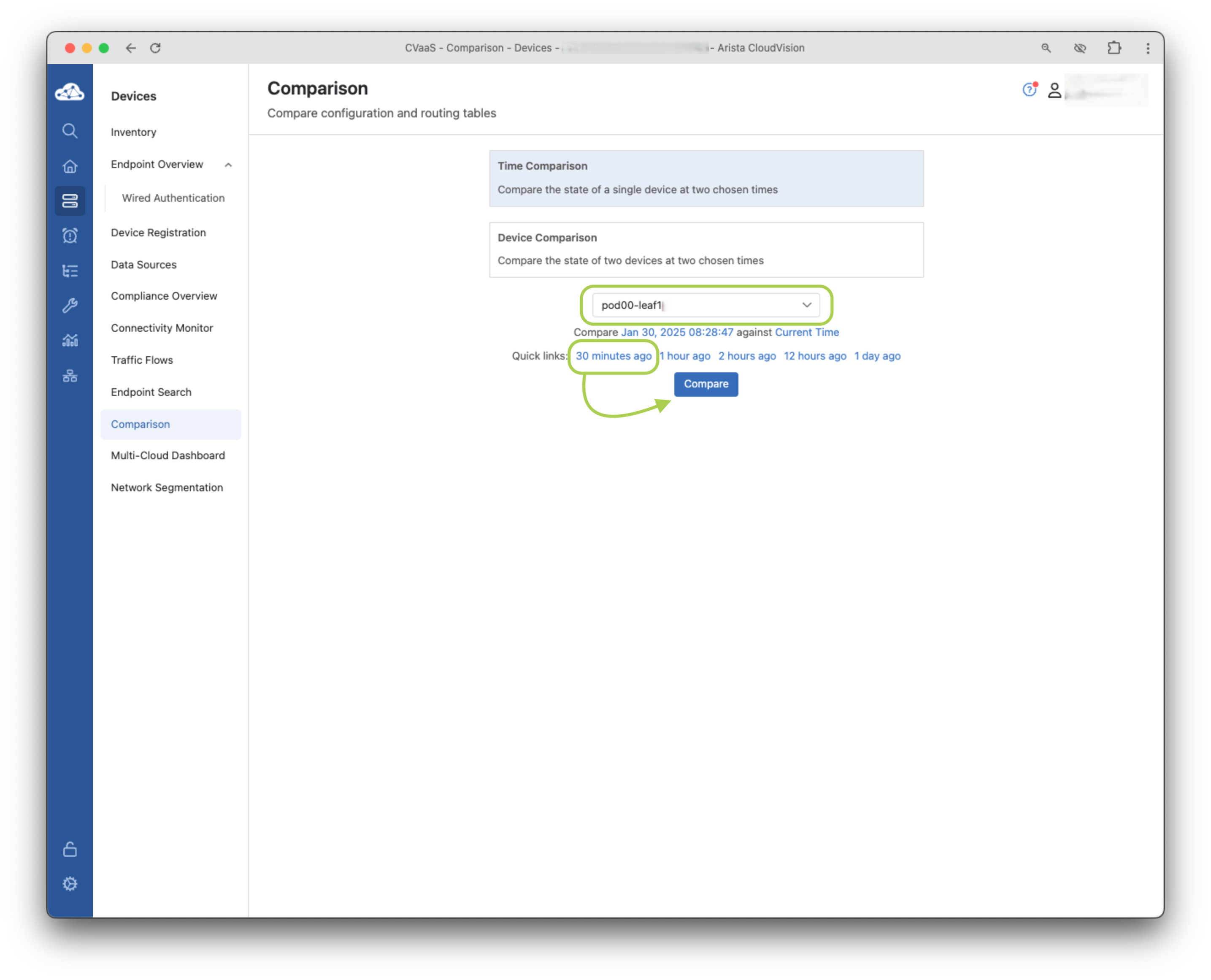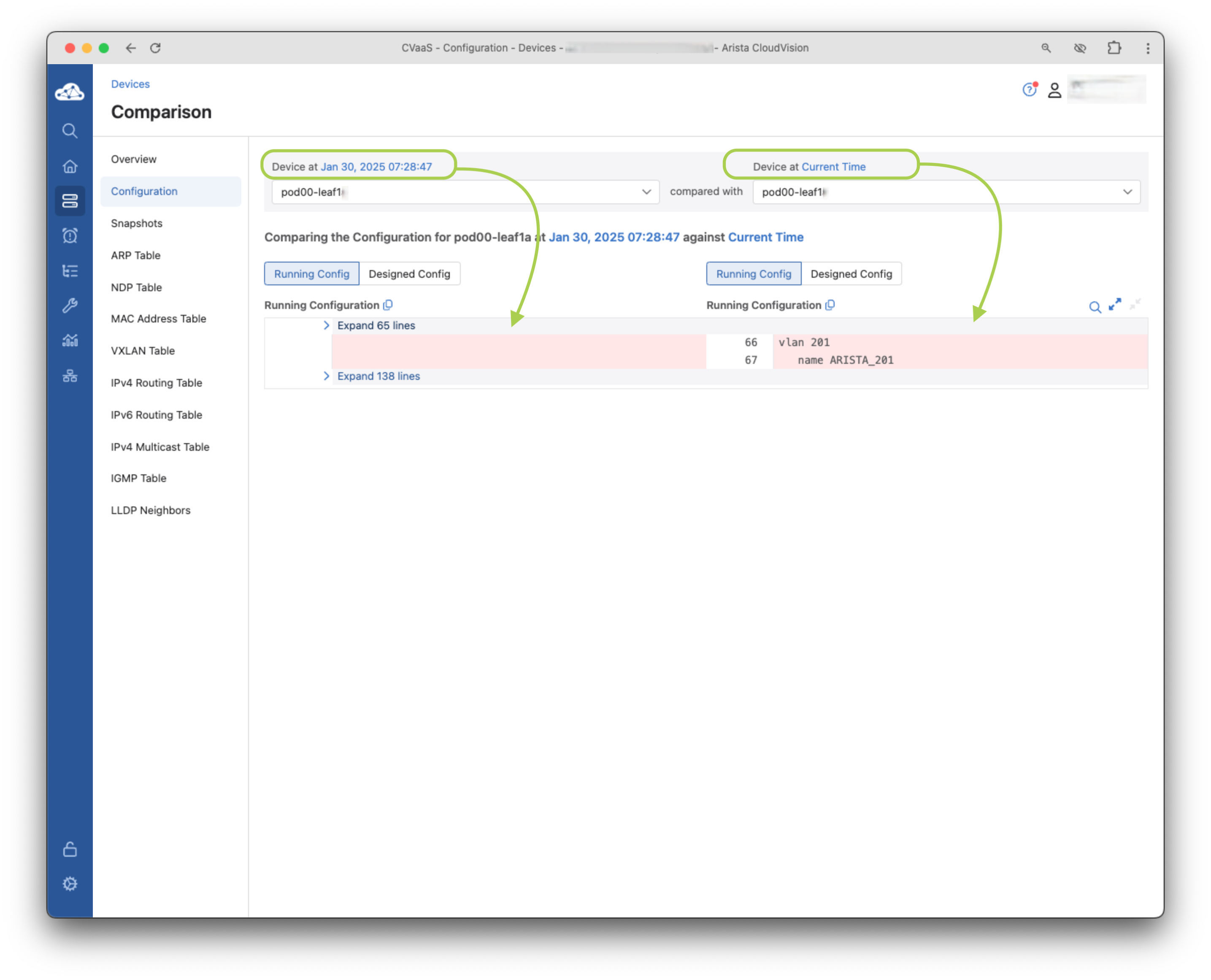 We expect the configuration changed within the last 30 minutes, but all streaming data from the switch (including configuration) is stored in a timeseries database. So anything from routing table, MAC, ARP, and more is accessible for historical review and comparisons like this!