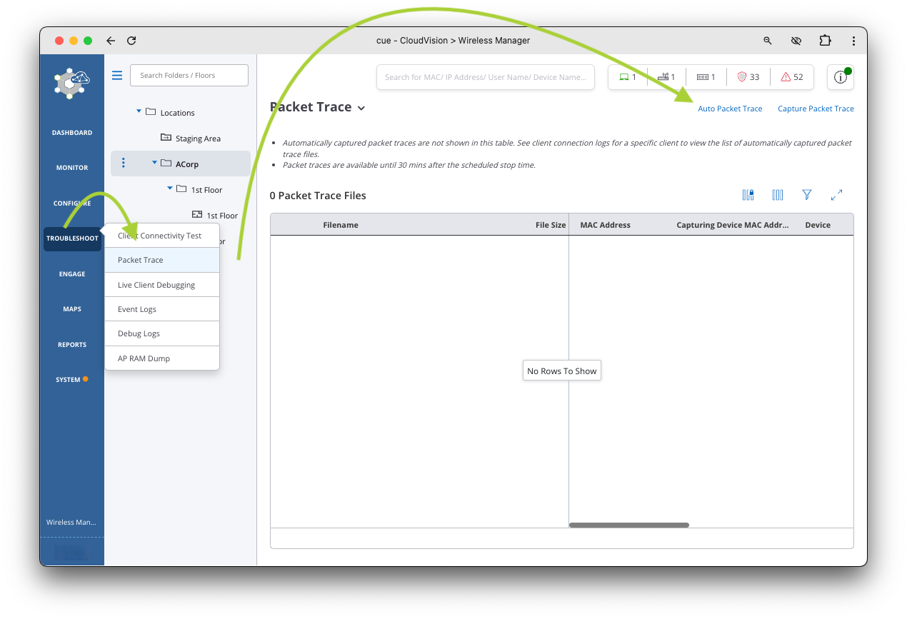 Troubleshootin the left hand menu, then clickPacket Trace. -