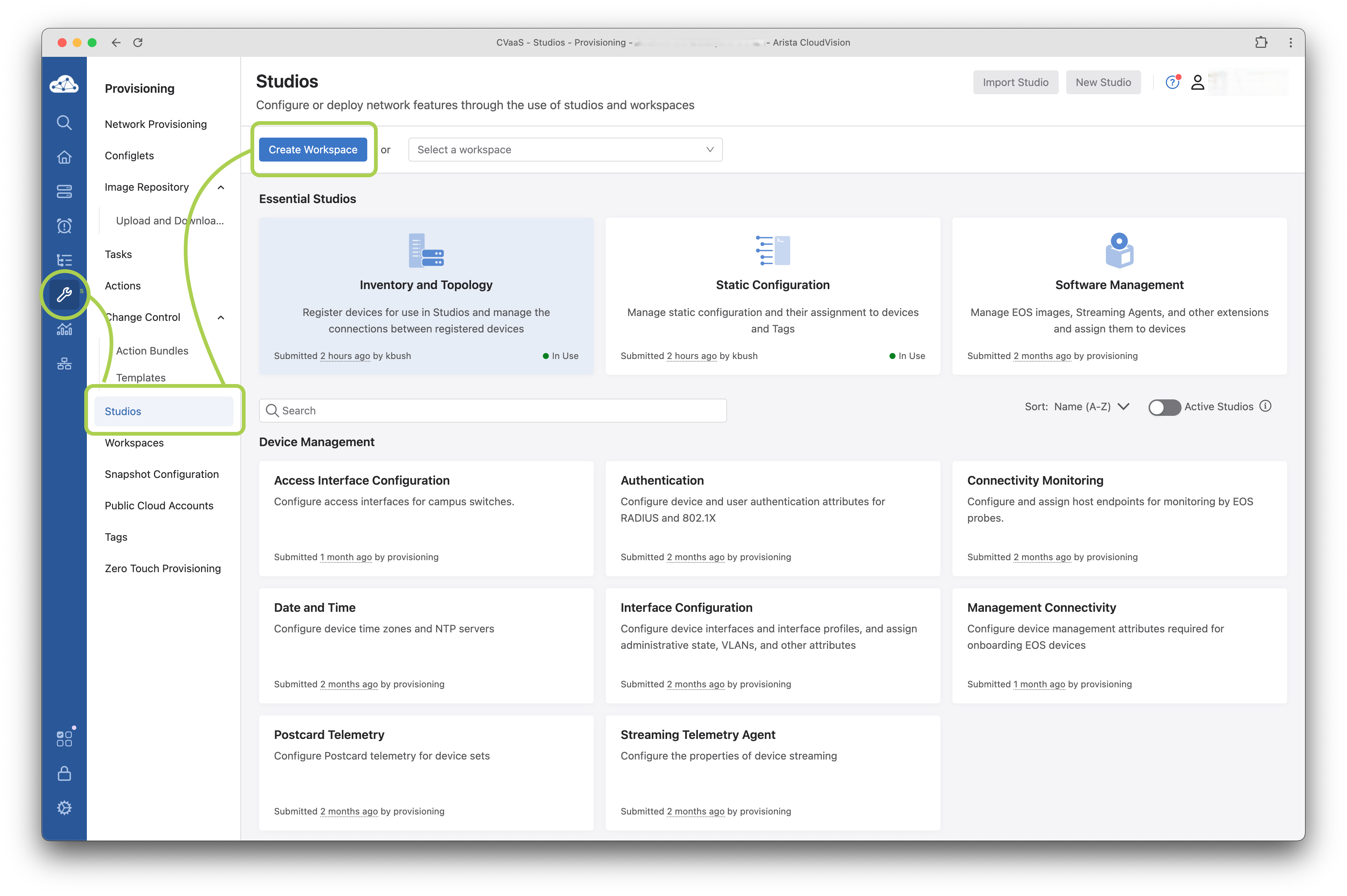 Provisioningmenu option, then chooseStudios. - Let's open the