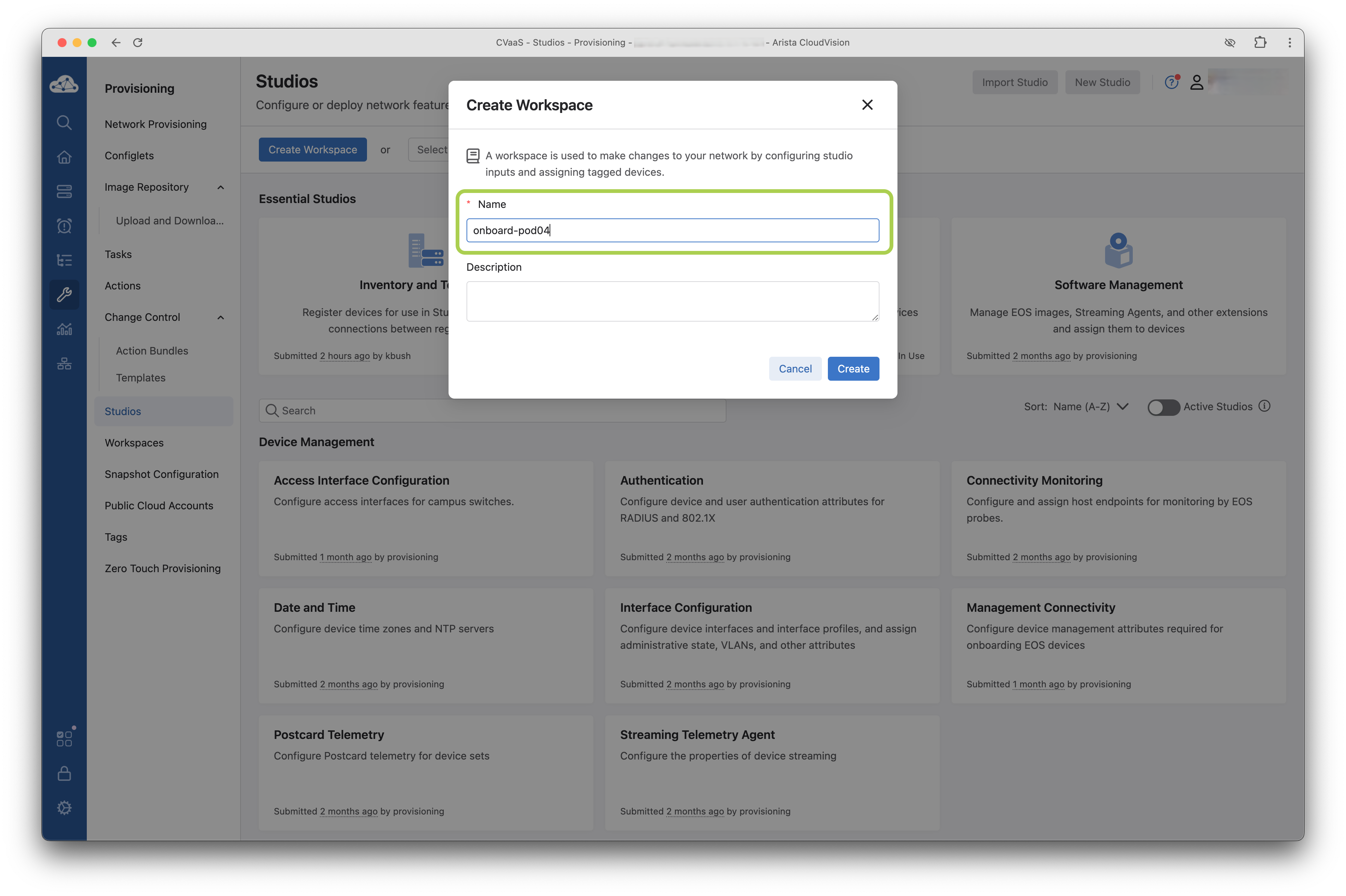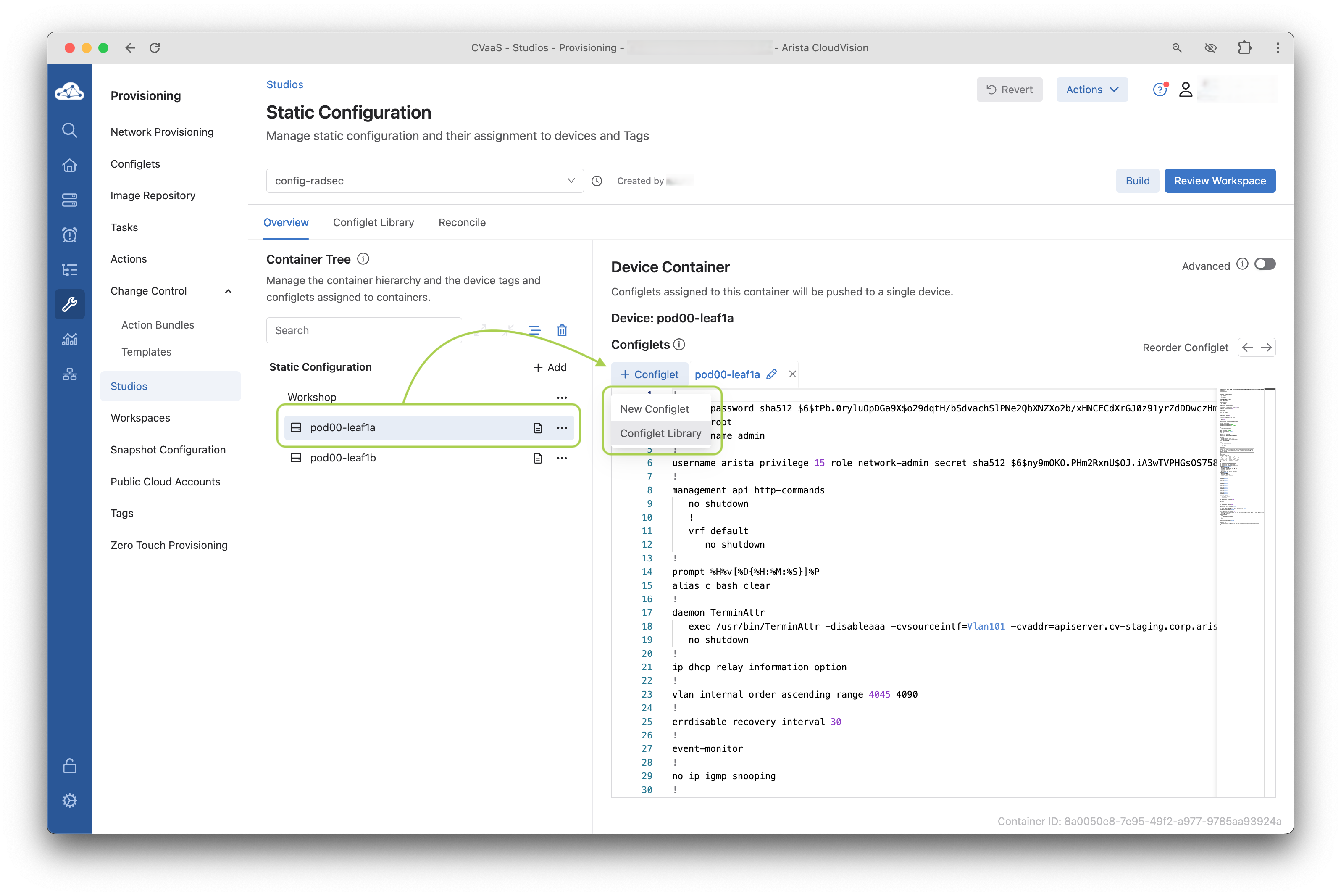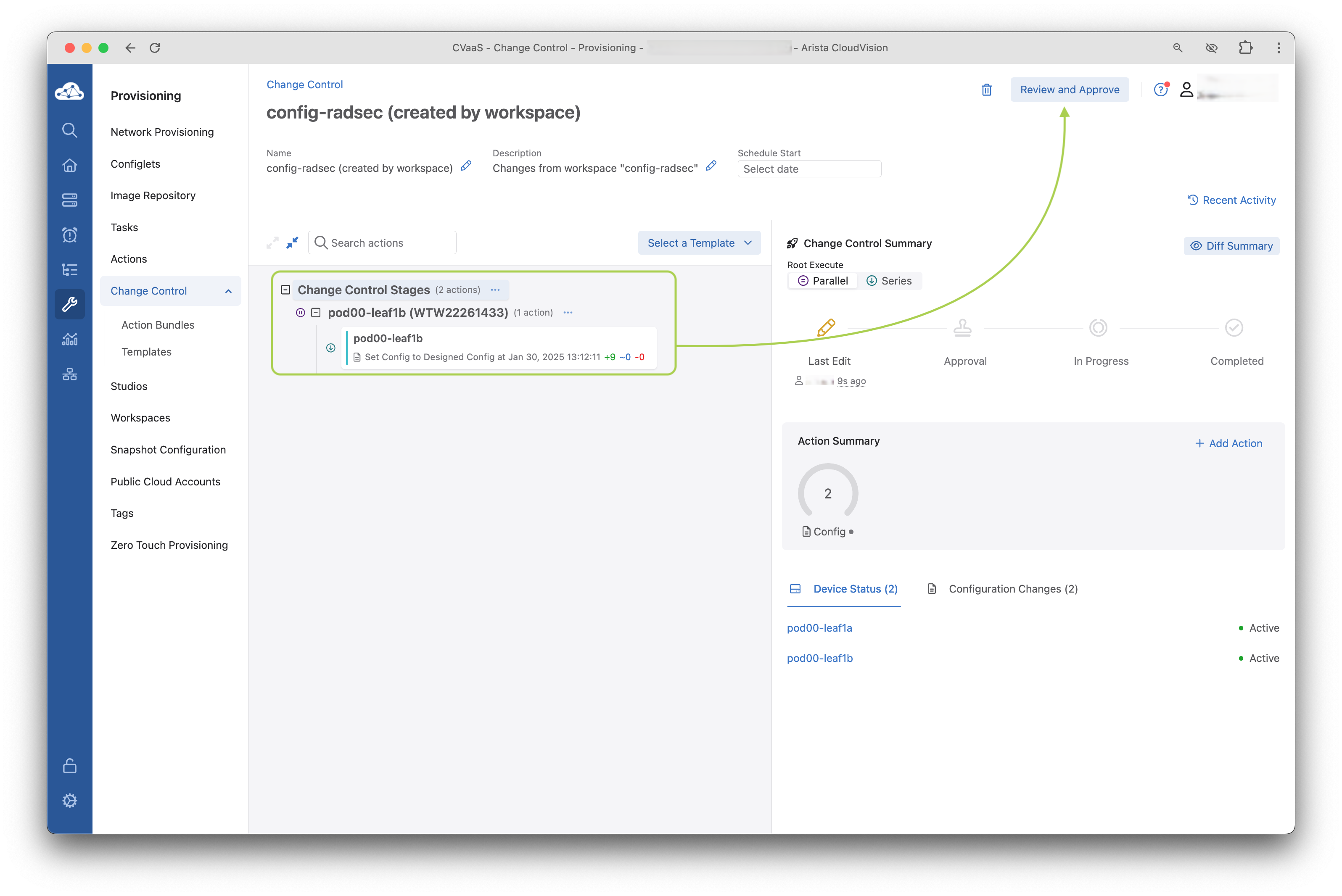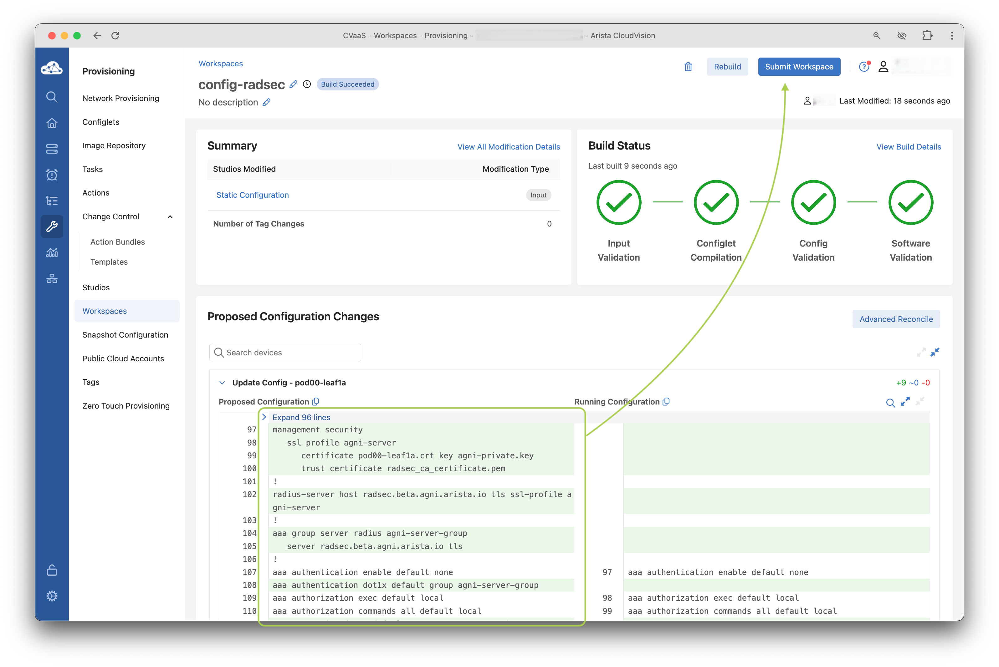 Review Workspaceto review all the changes proposed to the CloudVision Studio -