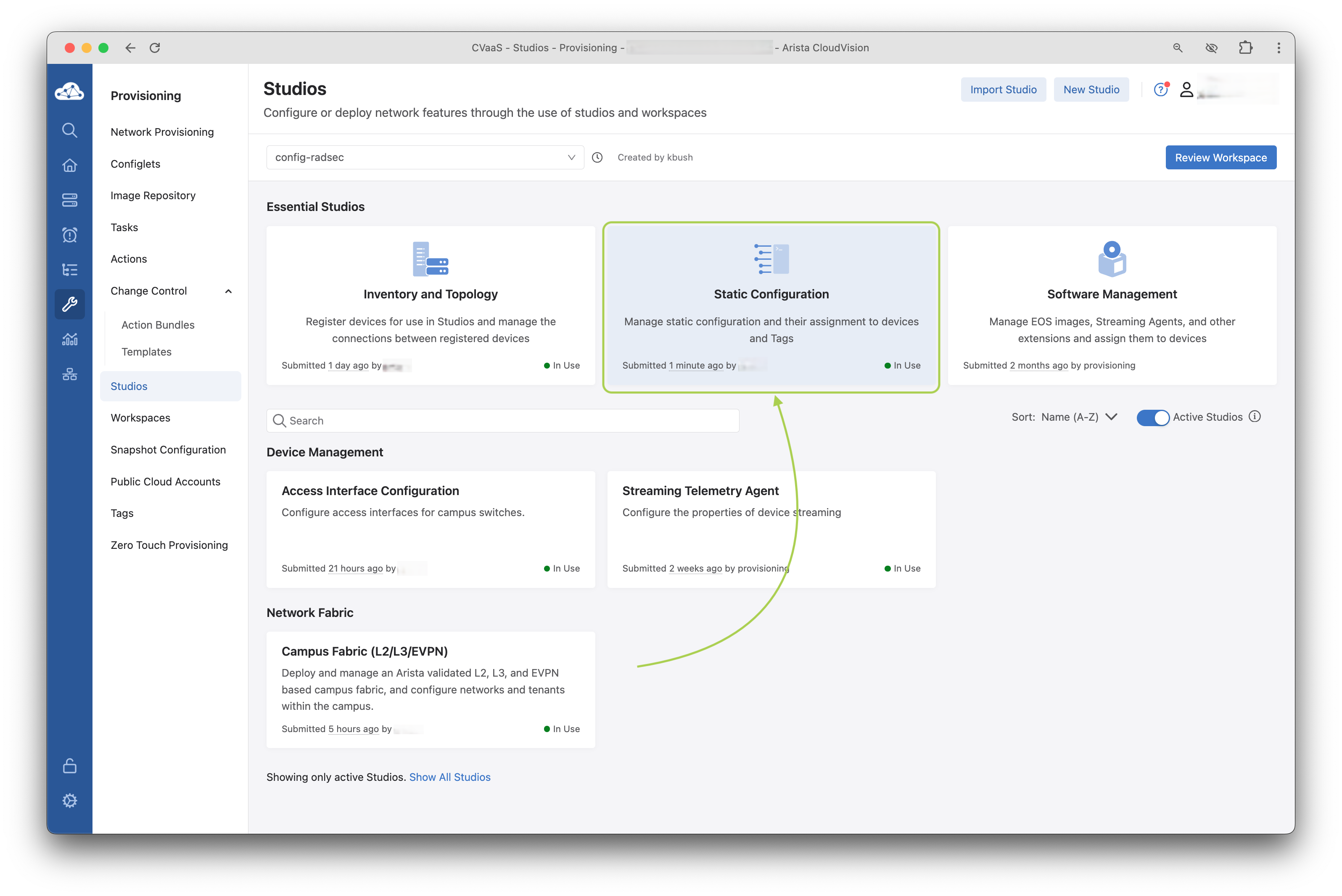 Studioshome page, disable theActive Studiostoggle to display all available CloudVision Studios (which when enabled will only show used/active Studios).The toggle may already be in the disabled position