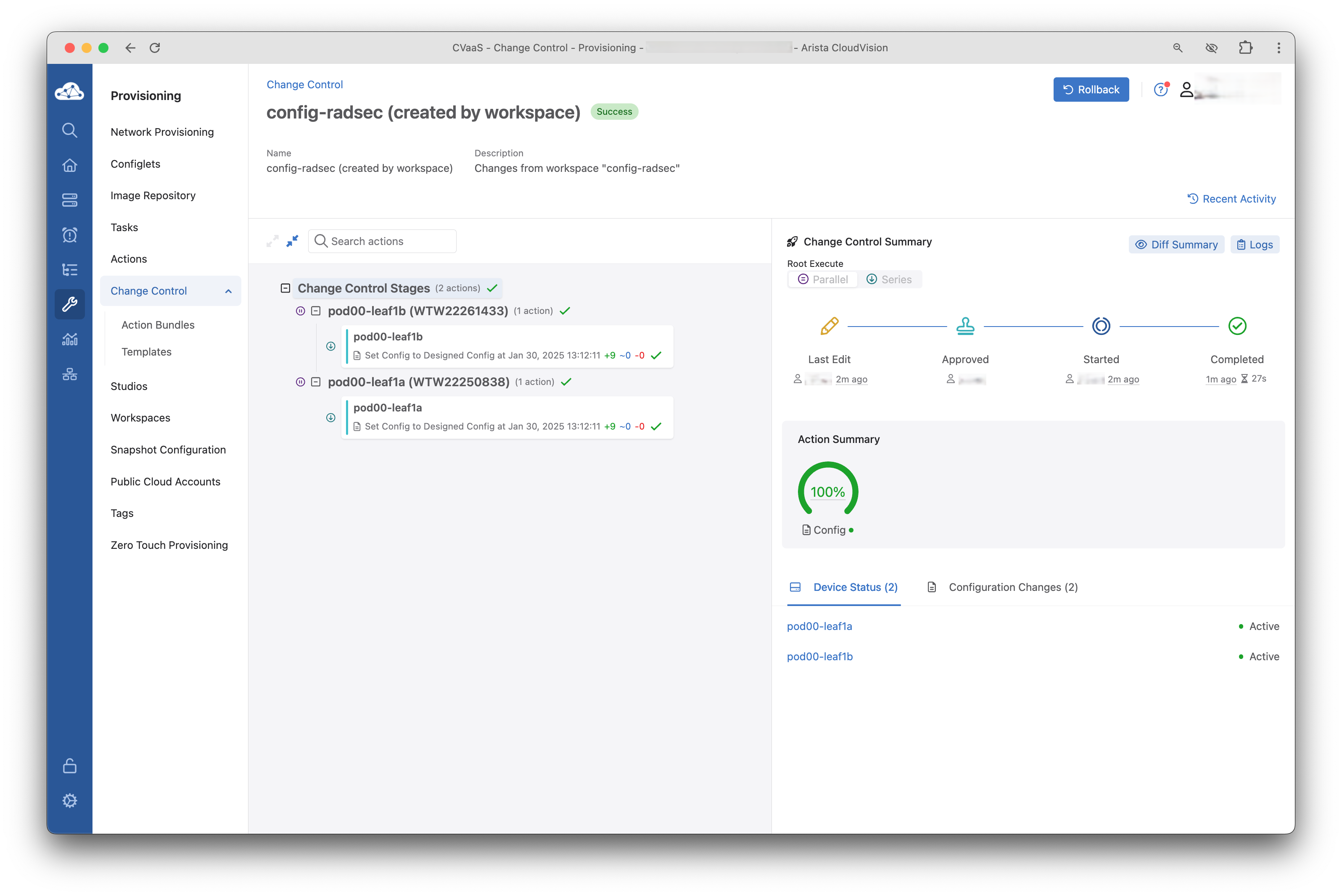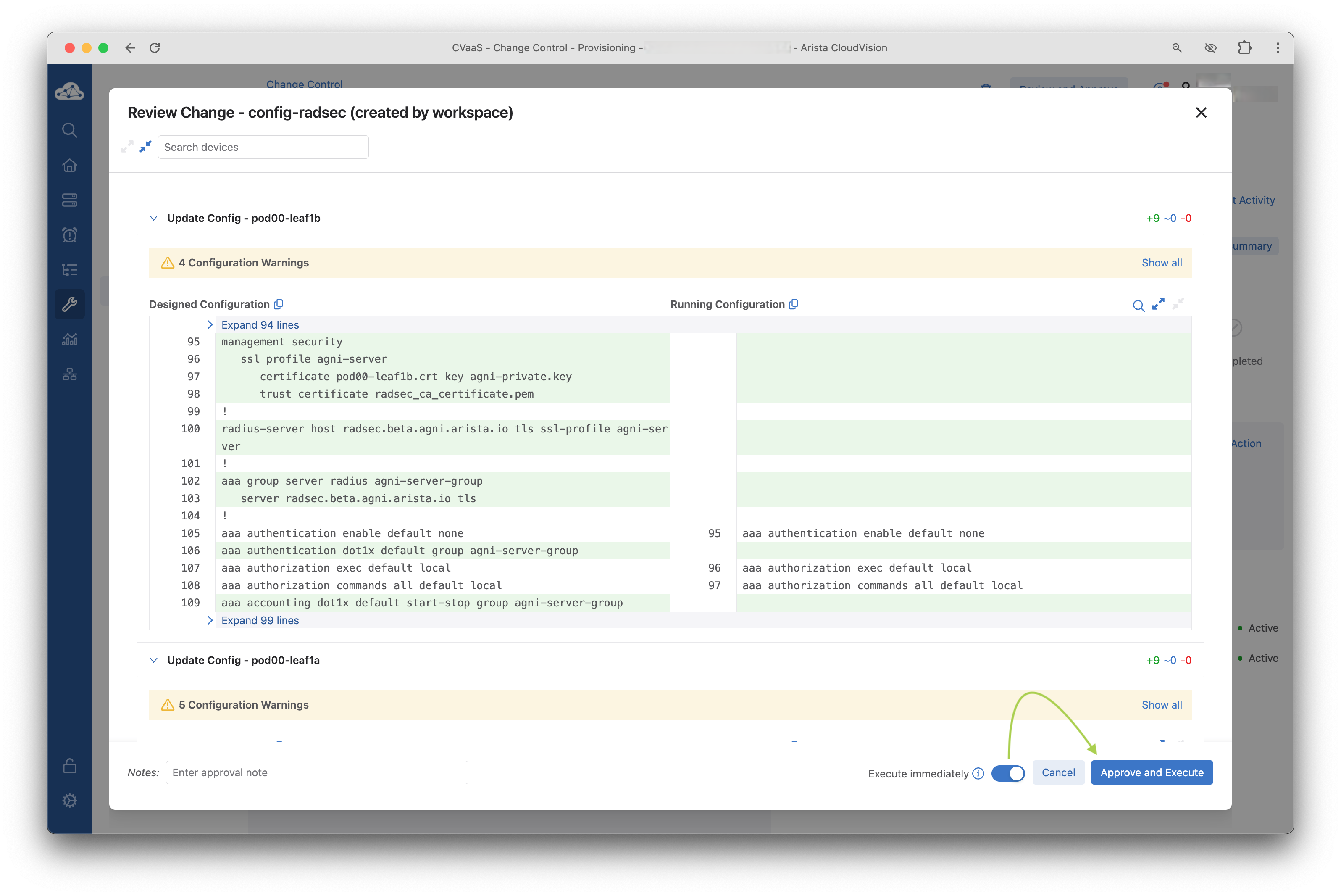 The change control will execute and apply all the RadSec configuration changes to the device. This will enable RadSec connectivity between the switch and AGNI.