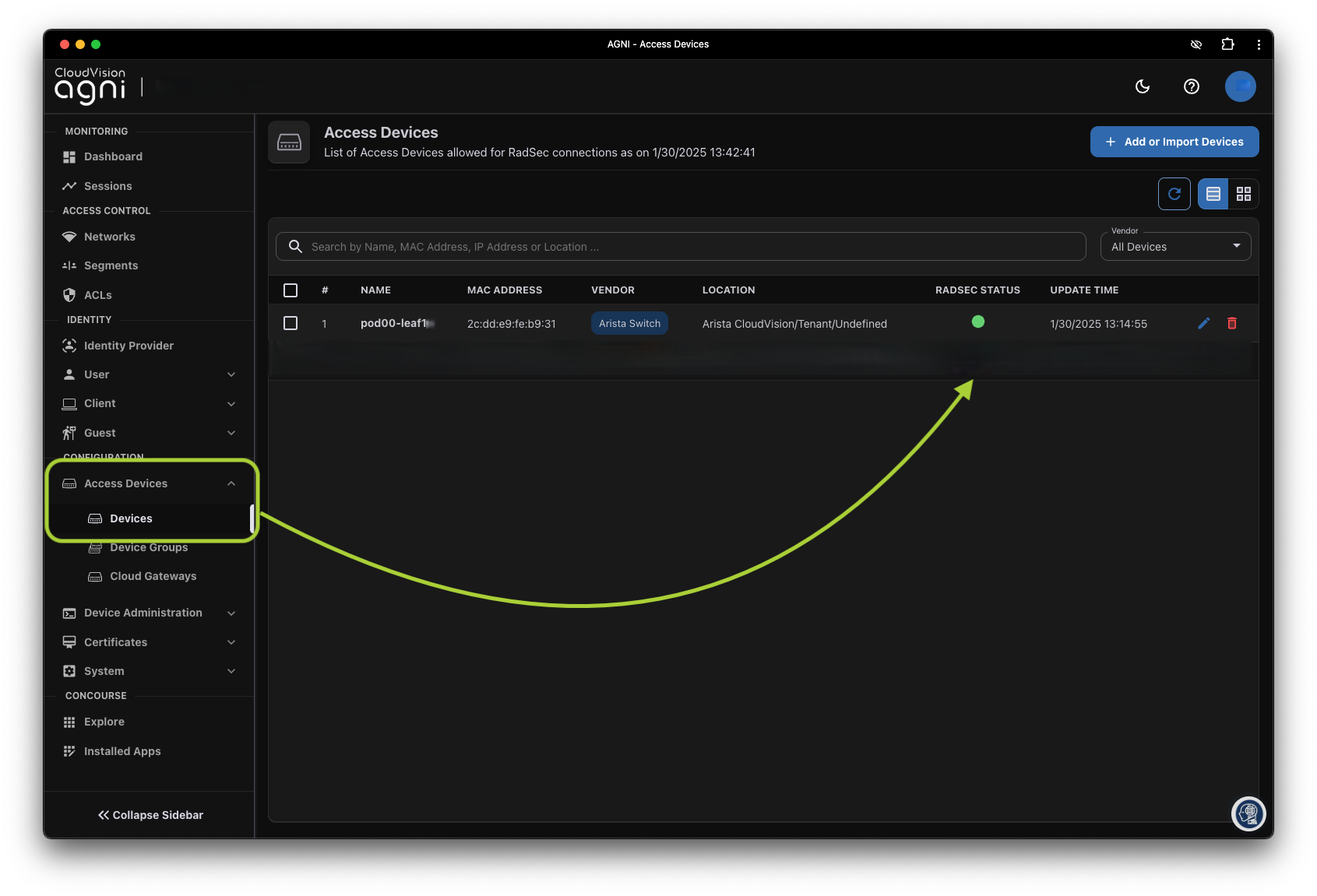 Access Devices > Devicesto confirm the RadSec connection is up. -