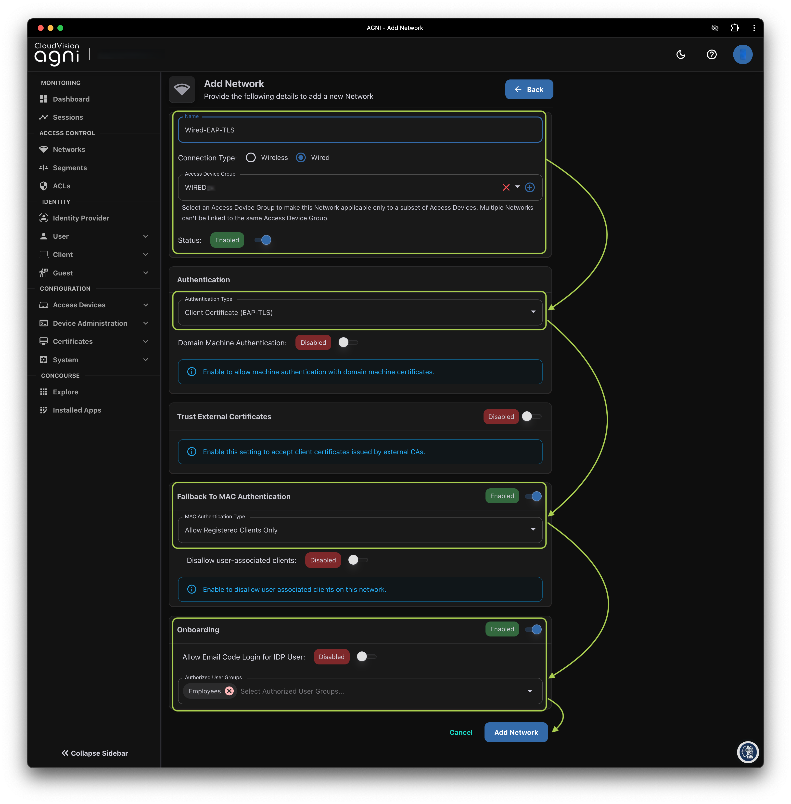 Create Wired EAP-TLS Network and Segment¶