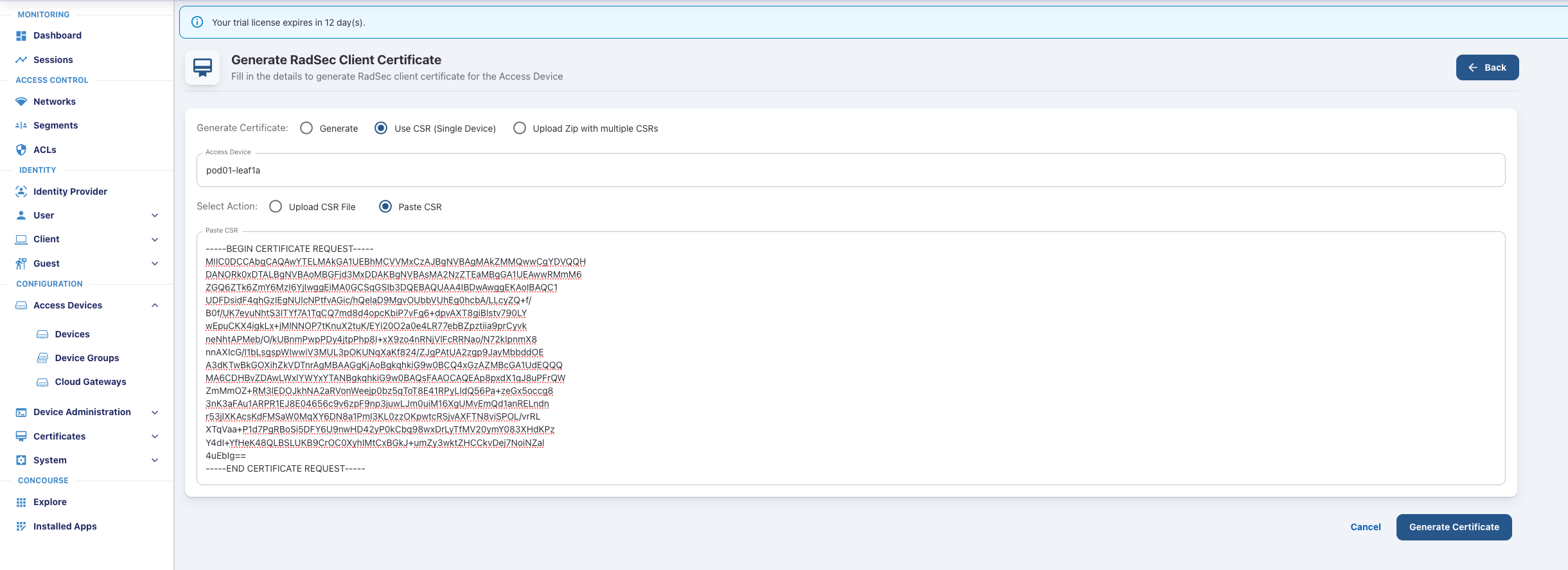 Download the RadSec CA certificate (radsec_ca_certificate.pem) by clicking Download Certificate.