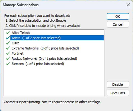 Subscriptionsthen selectManage Subscriptions. Select theAristaprice list and clickEnable. Optionally click onPrice Liststo view the price list details. USD and EUR price lists are available. ClickOKto continue.