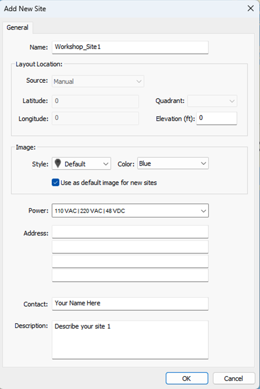 Sitesand click onNew Site. Provide a name for your site, select the desiredPower.Contact,Descriptionare optional and clickOKcontinue. Double-click on your workshop name on the map. A clean worshop space will be provided.
