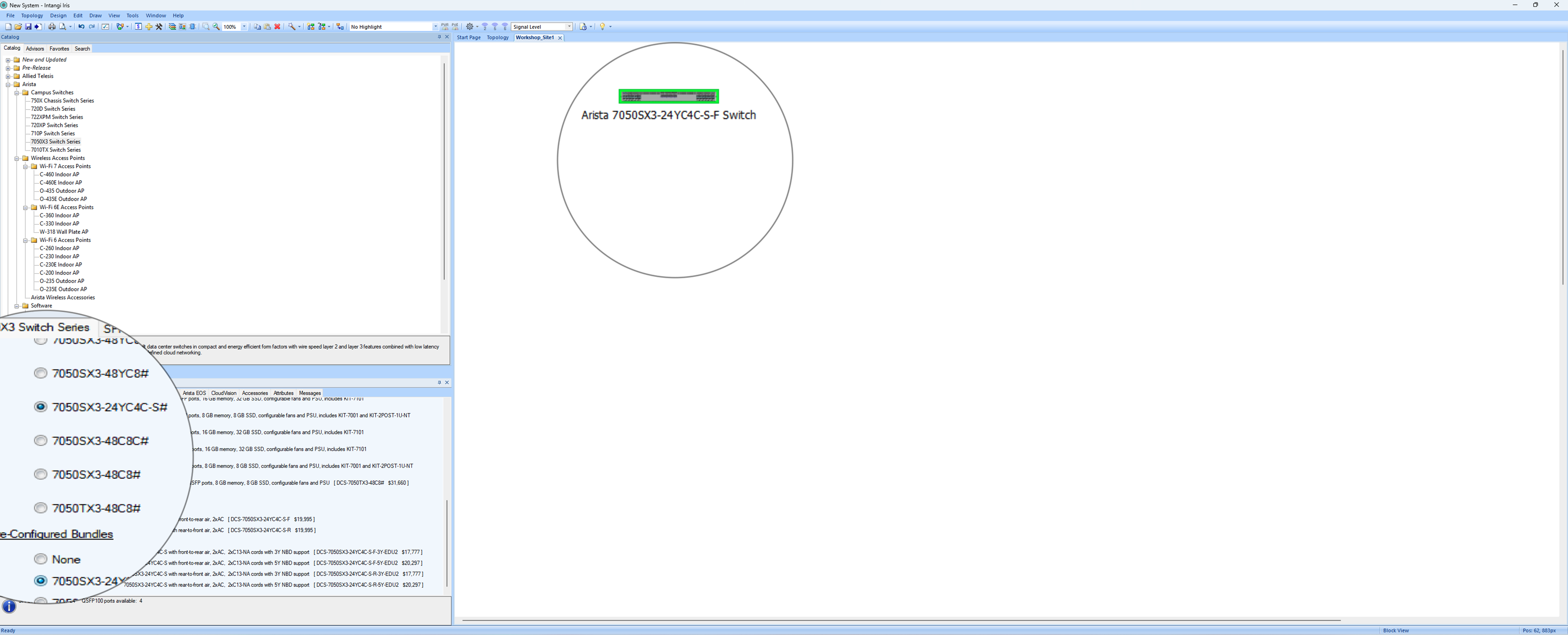 7050X Switch Series, select one of the pre-configured7050SX3-24YC2-Fbundles.-Fis with front-to-back fan trays,-Ris rear-to-front. Cut-and-paste the device on the site workspace to build a two-switch spine network layer.