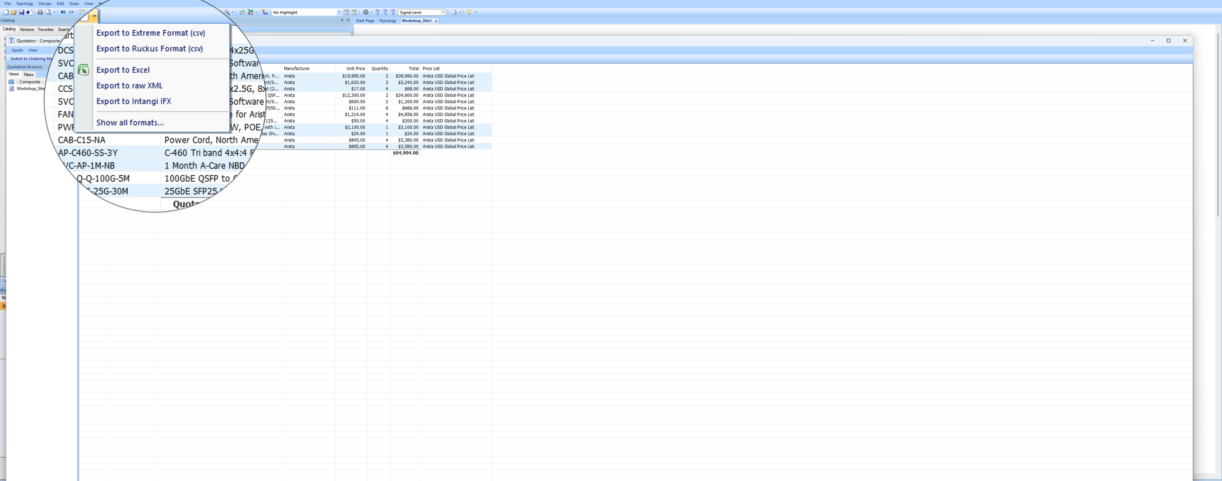 Quotation Composite Viewwill appear. You can see the devices and features selected for your design. You can also see the price for each device and feature. The total price is also displayed. Hover your cursor over theExport menuand selectExport to Excelto download the BOM.